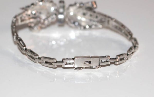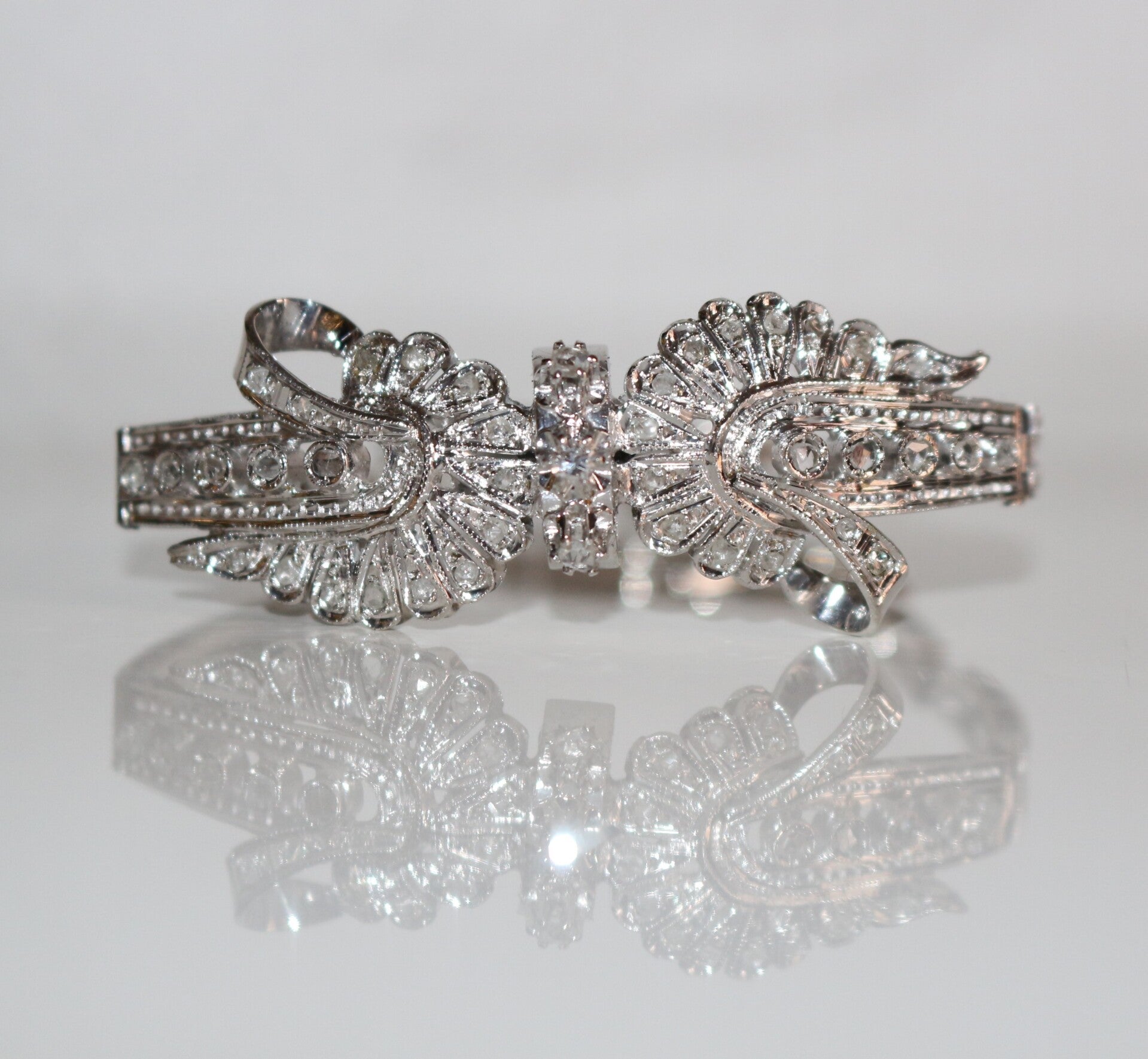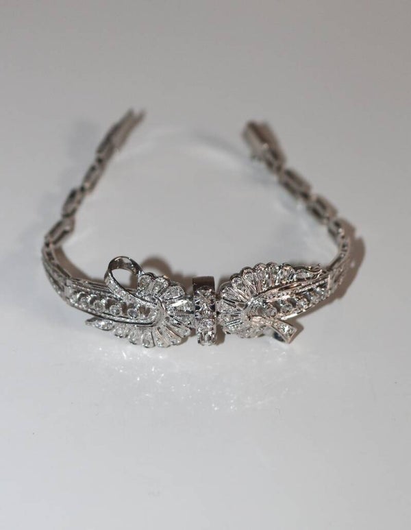 Bracelet en or blanc 18 carats 750/1000e à double volute et ruban, serti de petits diamants, taille rose, dont trois centraux et 5 en chute de part et d'autre. Le diamant central est taillé brillant. Travail des années 60-70, étranger.