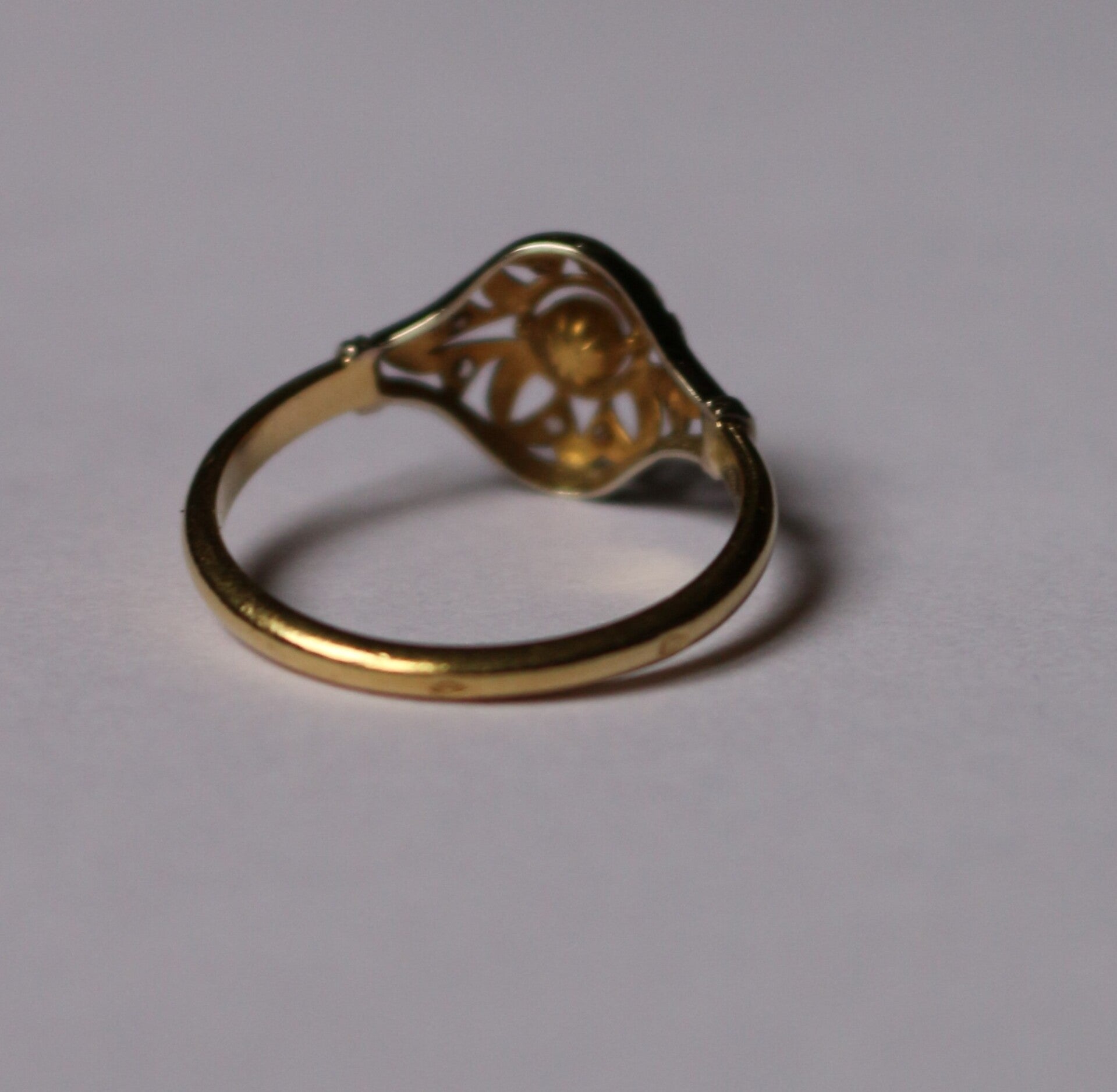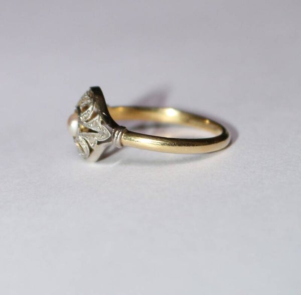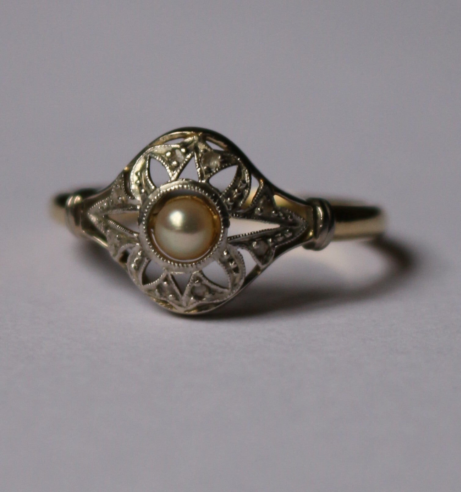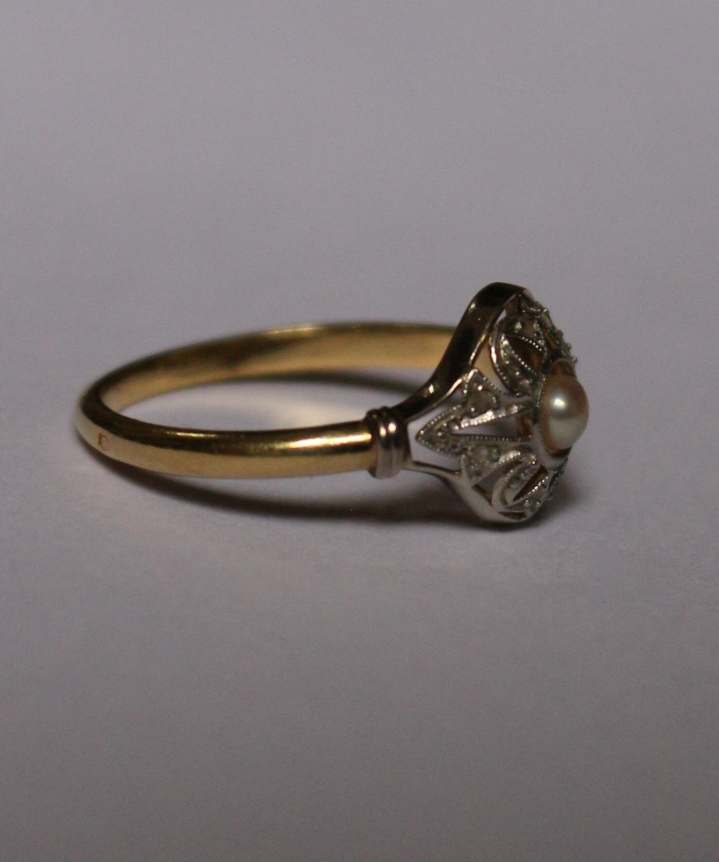Bague d'époque Art Déco deux ors 750/1000e (18 carats) présentant un plateau finement ajouré orné en son sommet d'une petite perle entourée de petites pierres blanches