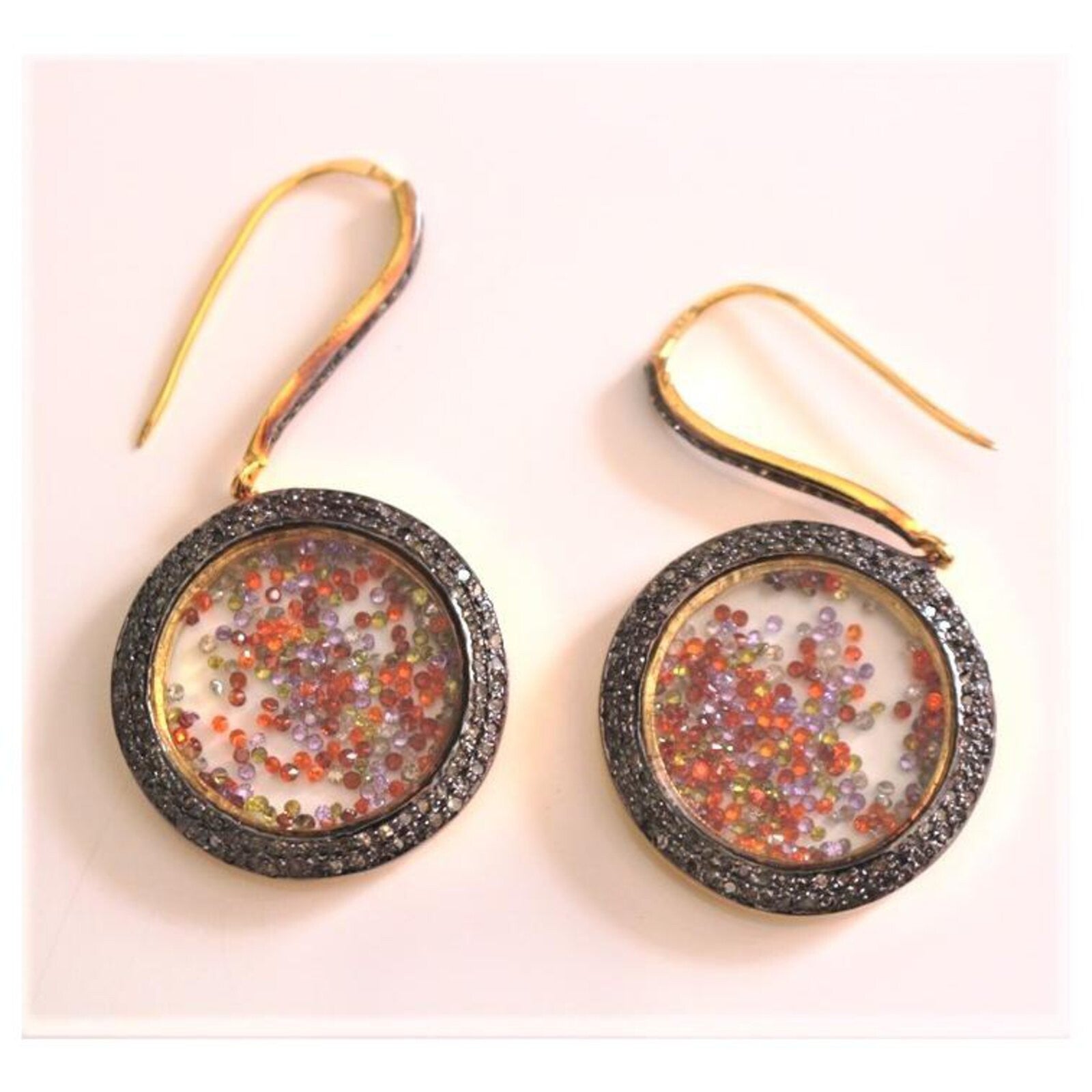 Paire de pendants d'oreilles en argent vermeillé et patiné 925/1000e, présentant deux disques de verre renfermant divers saphirs de couleur, dans un double entourage de diamants taille brillant