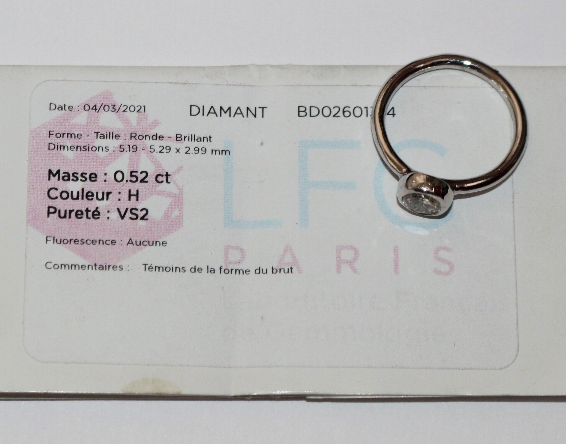 Accompagné d’un pli du LFG (laboratoire français de gemmologie) daté du 04.03.2021 et numéroté