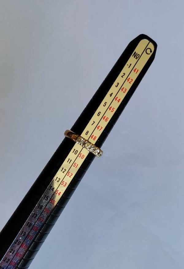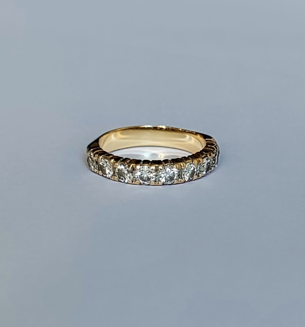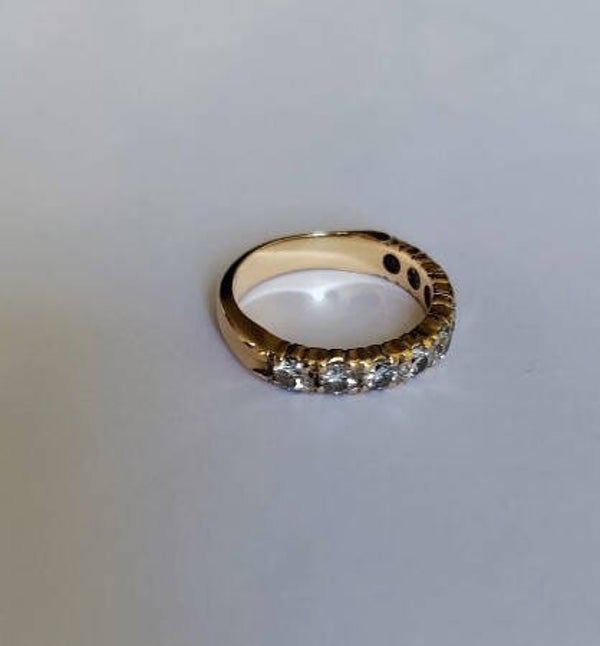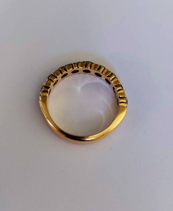 Alliance américaine demi-tour en or jaune 750/1000e (18 carats) sertie de 9 diamants taille brillant sertis griffes pour un total de 0,27 carat environ (2mm de diamètre)