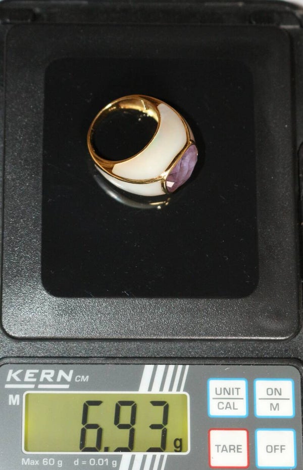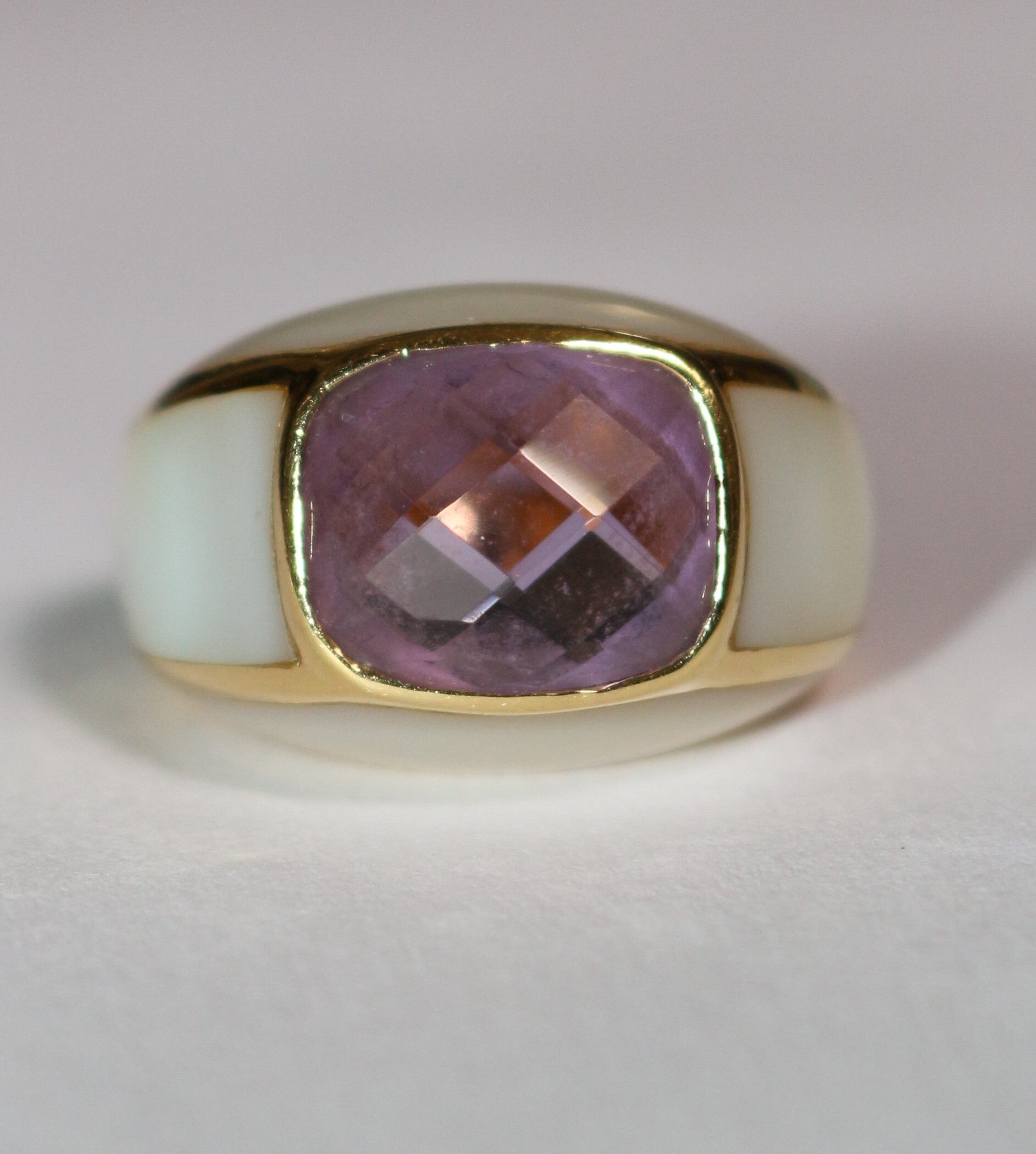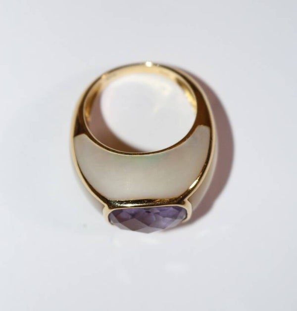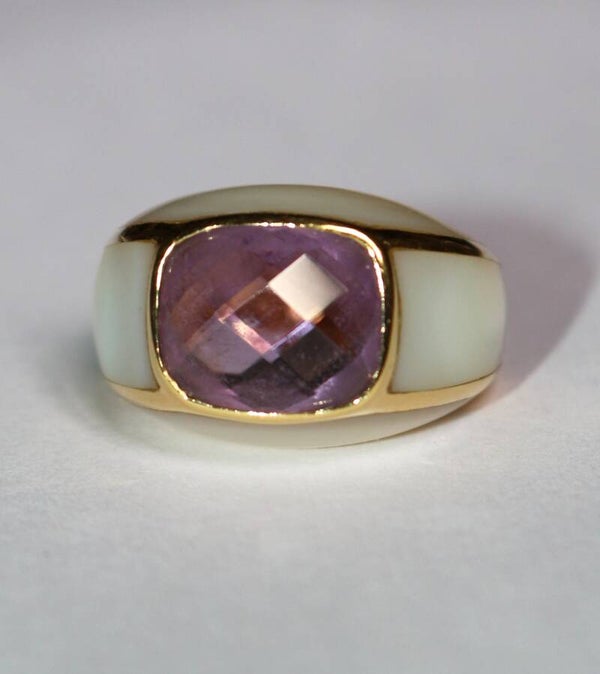 Bague jonc en or jaune 750/1000e (18 carats) ornée d'une améthyste taille coussin facettée (4.17 carats), épaulée des 4 côtés de plaques de nacre. Travail des années 2000.