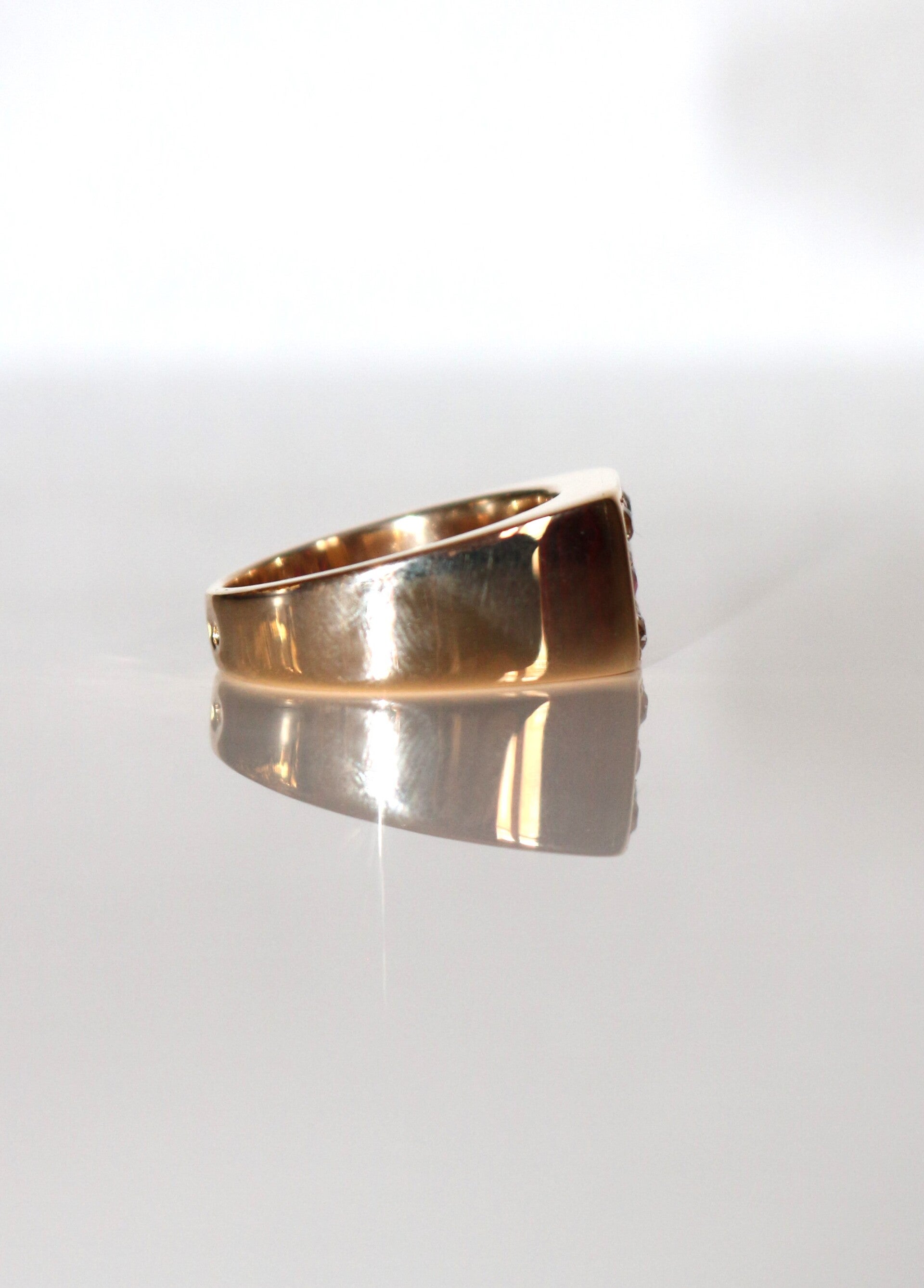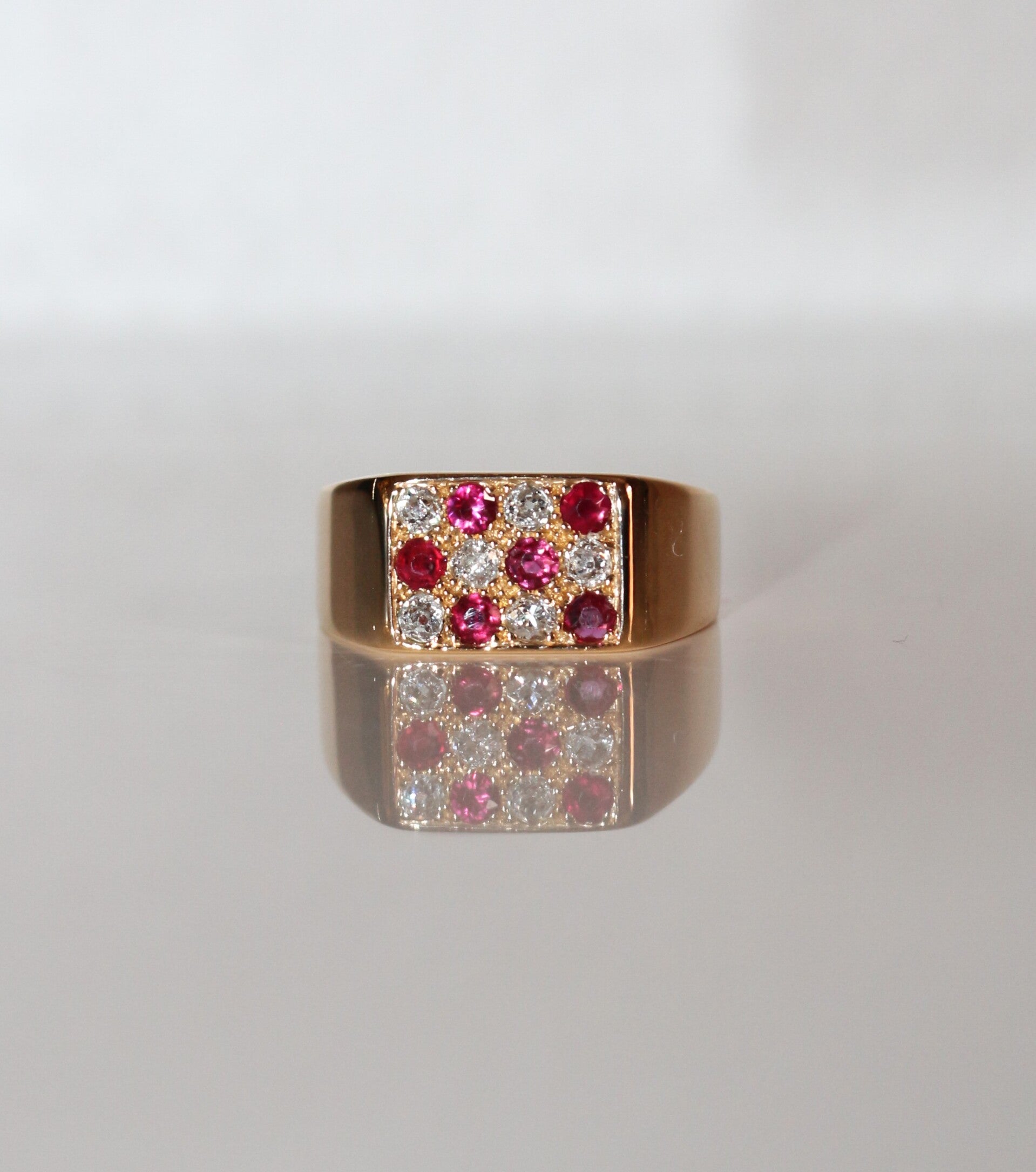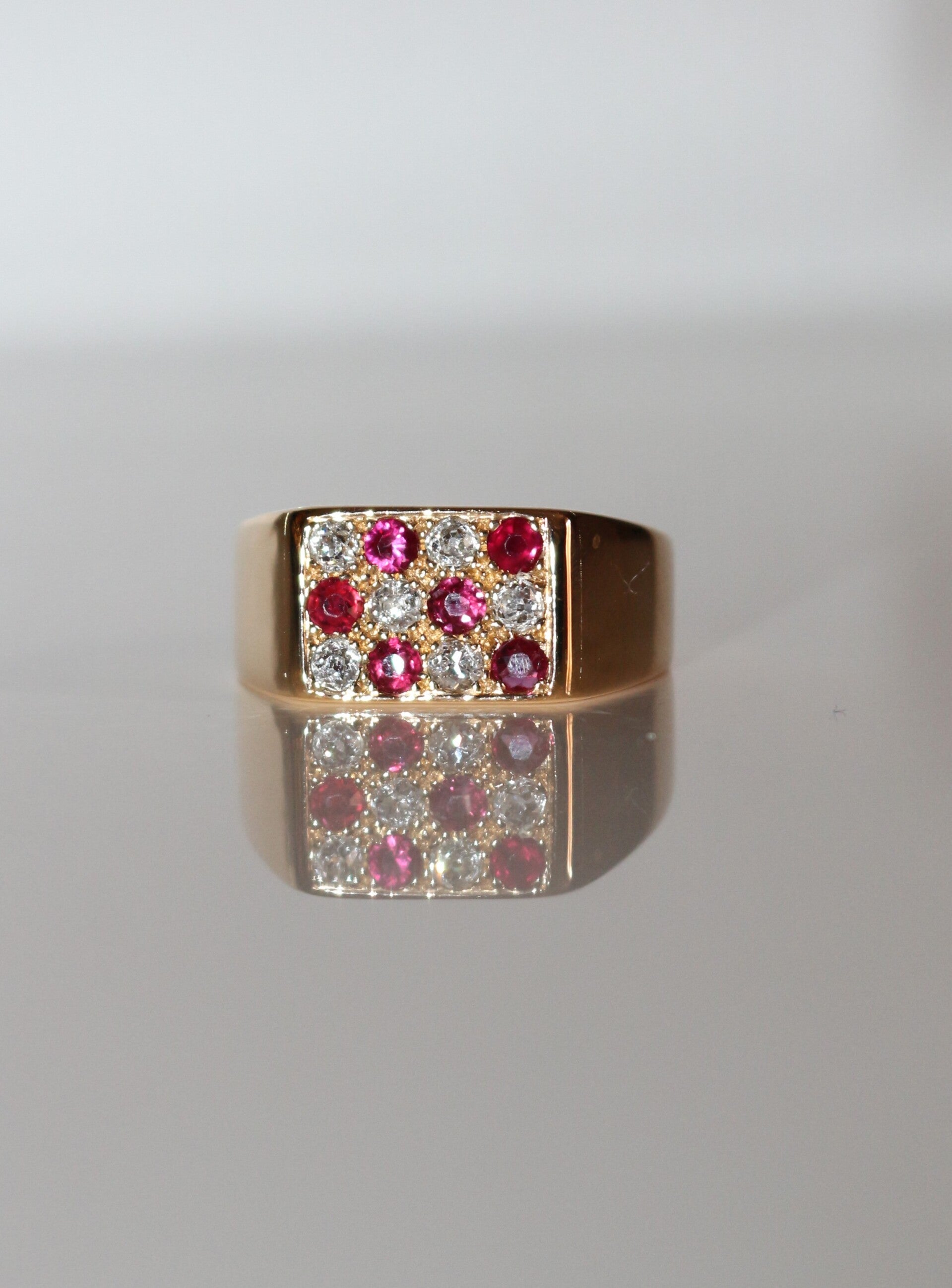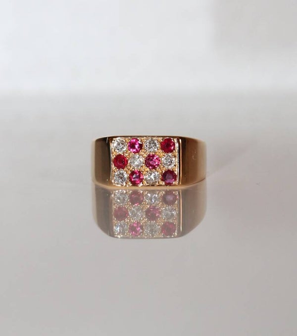 Bague chevalière rectangulaire en or jaune 750/1000e (18 carats) unisexe, sertie de 6 rubis de 2 mm de diamètre et de 6 diamants ronds de 2 mm de diamètre, XXe.