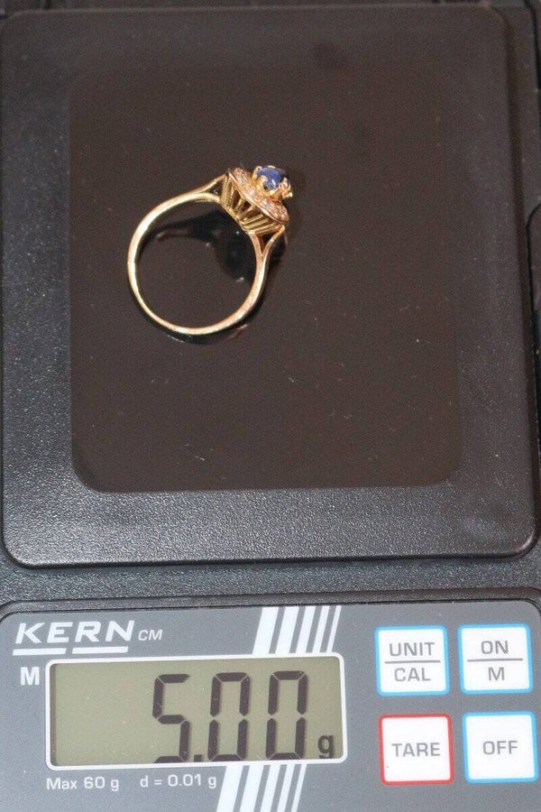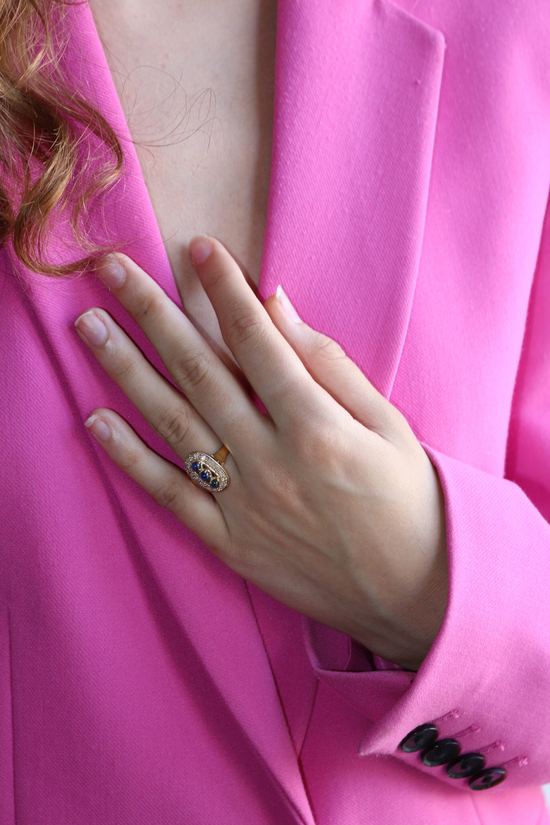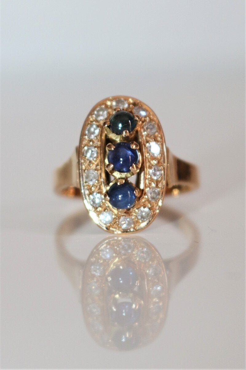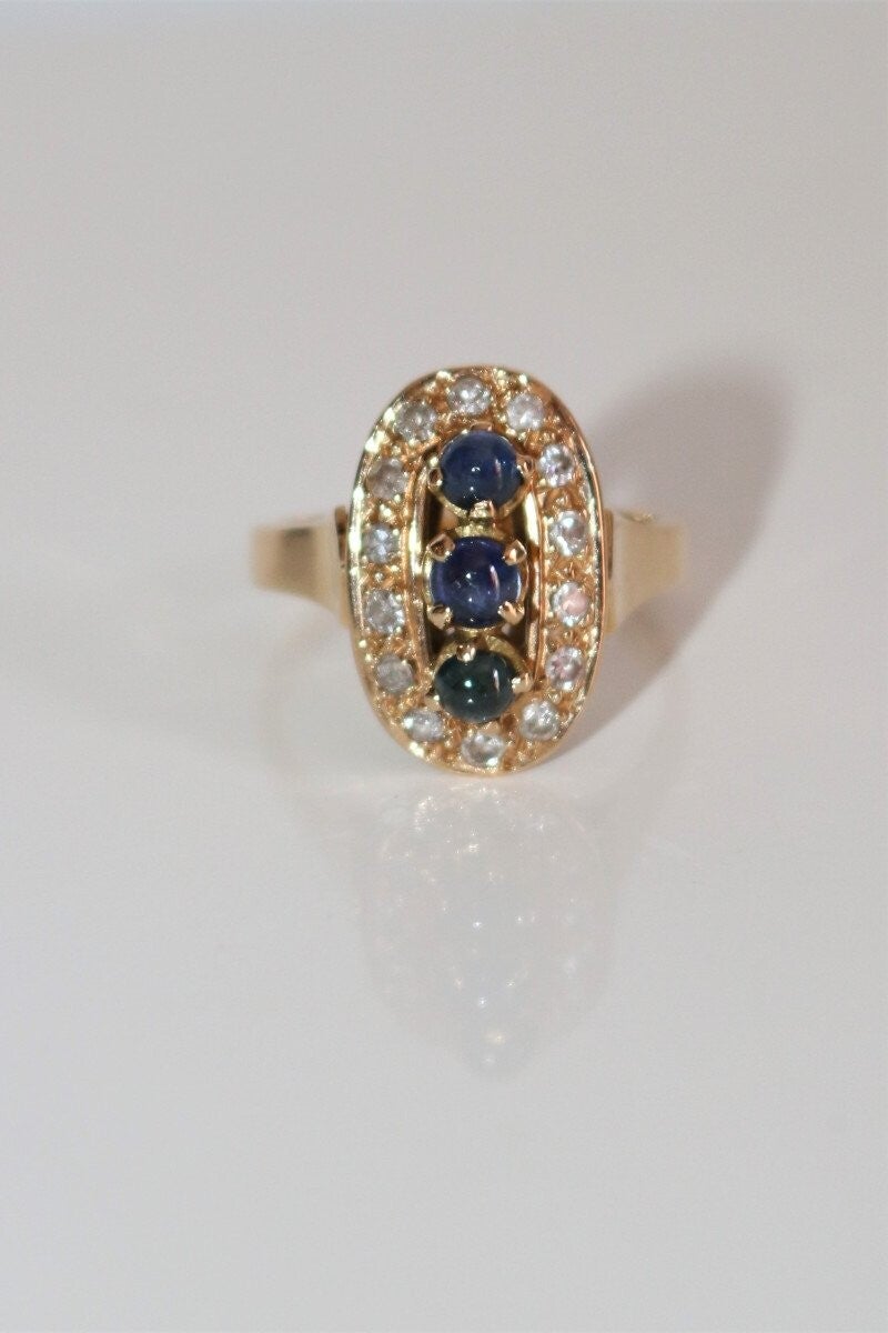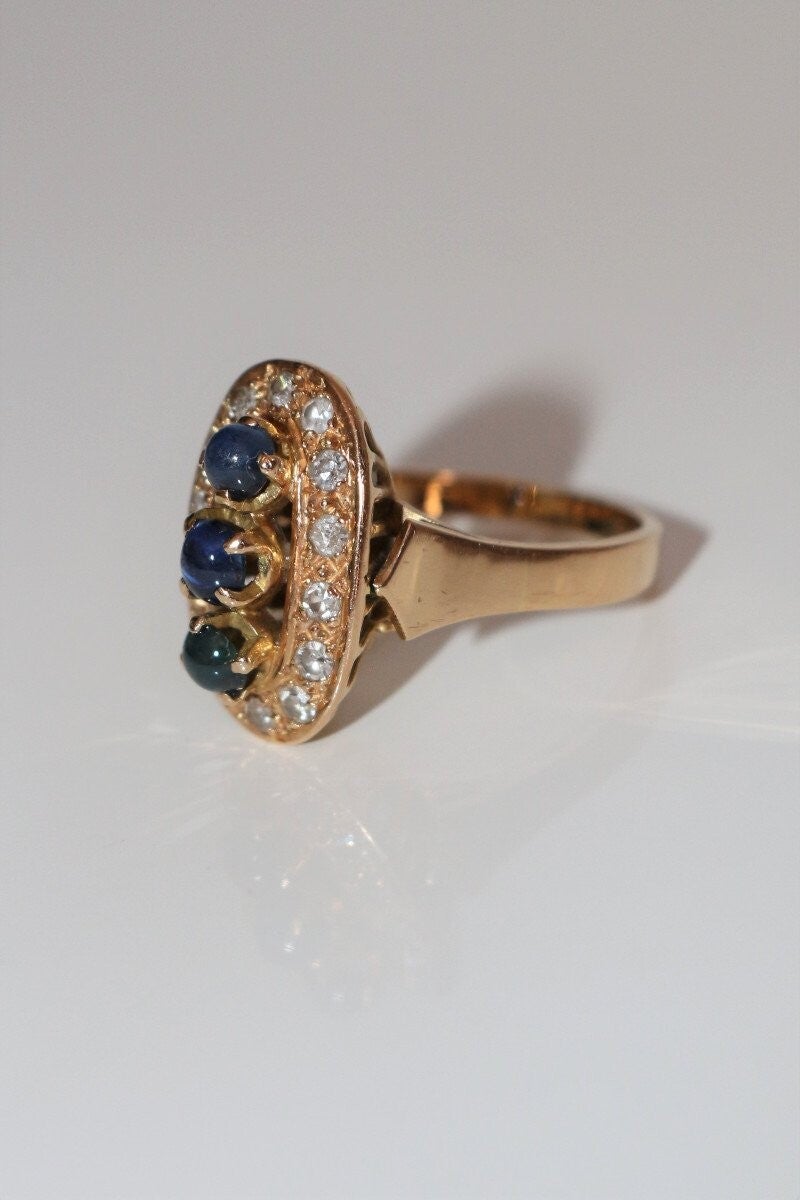 Bague en or jaune 750/1000e (18 carats) présentant une trilogie de petis saphirs ronds en cabochons (3.5 mm + 3.7 mm + 3.3 mm) de couleur dégradée du bleu au vert, entourés de 14 petits brillants ronds de 1.5mm de diamètre (0.30 ct au total environ)