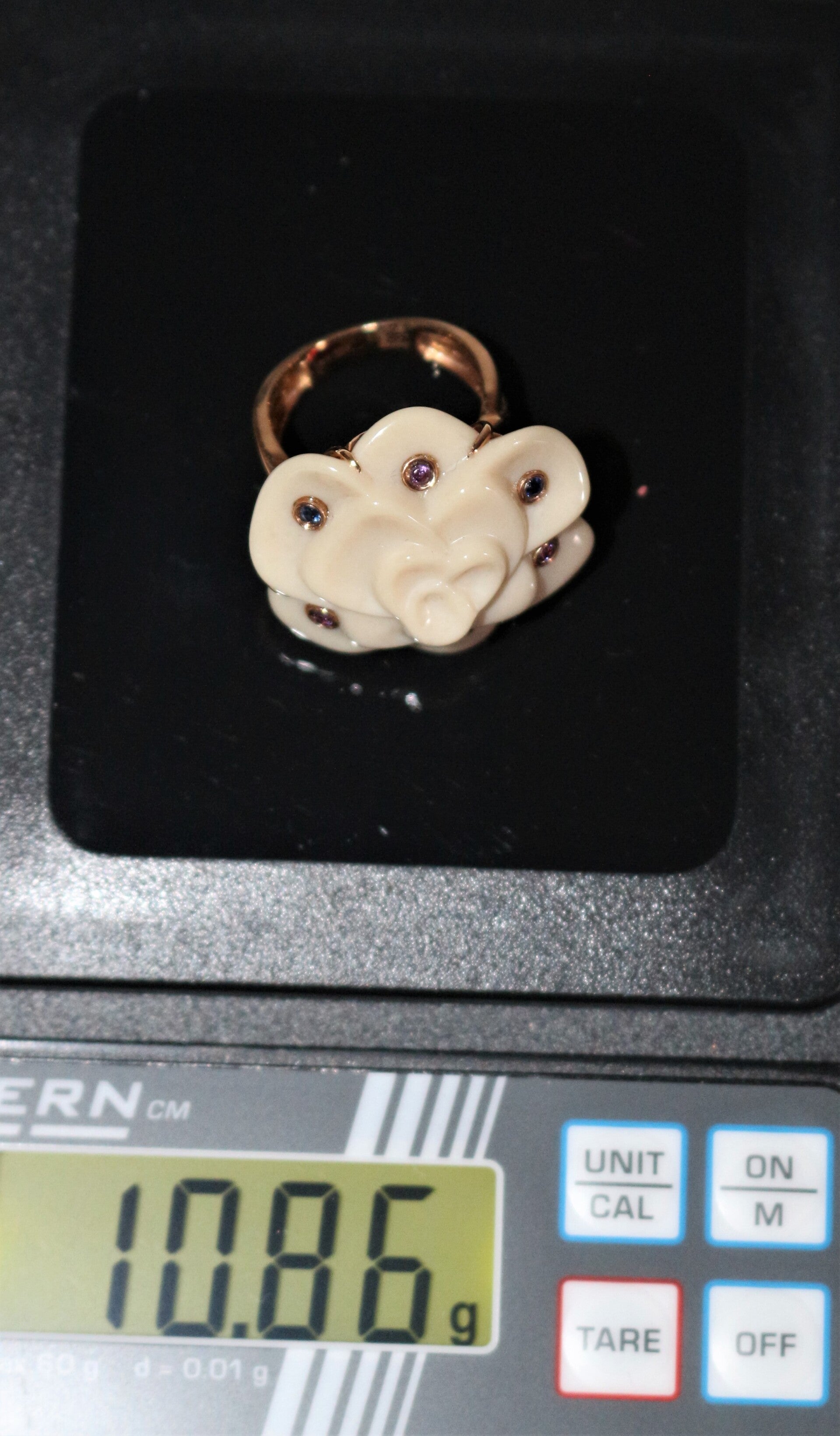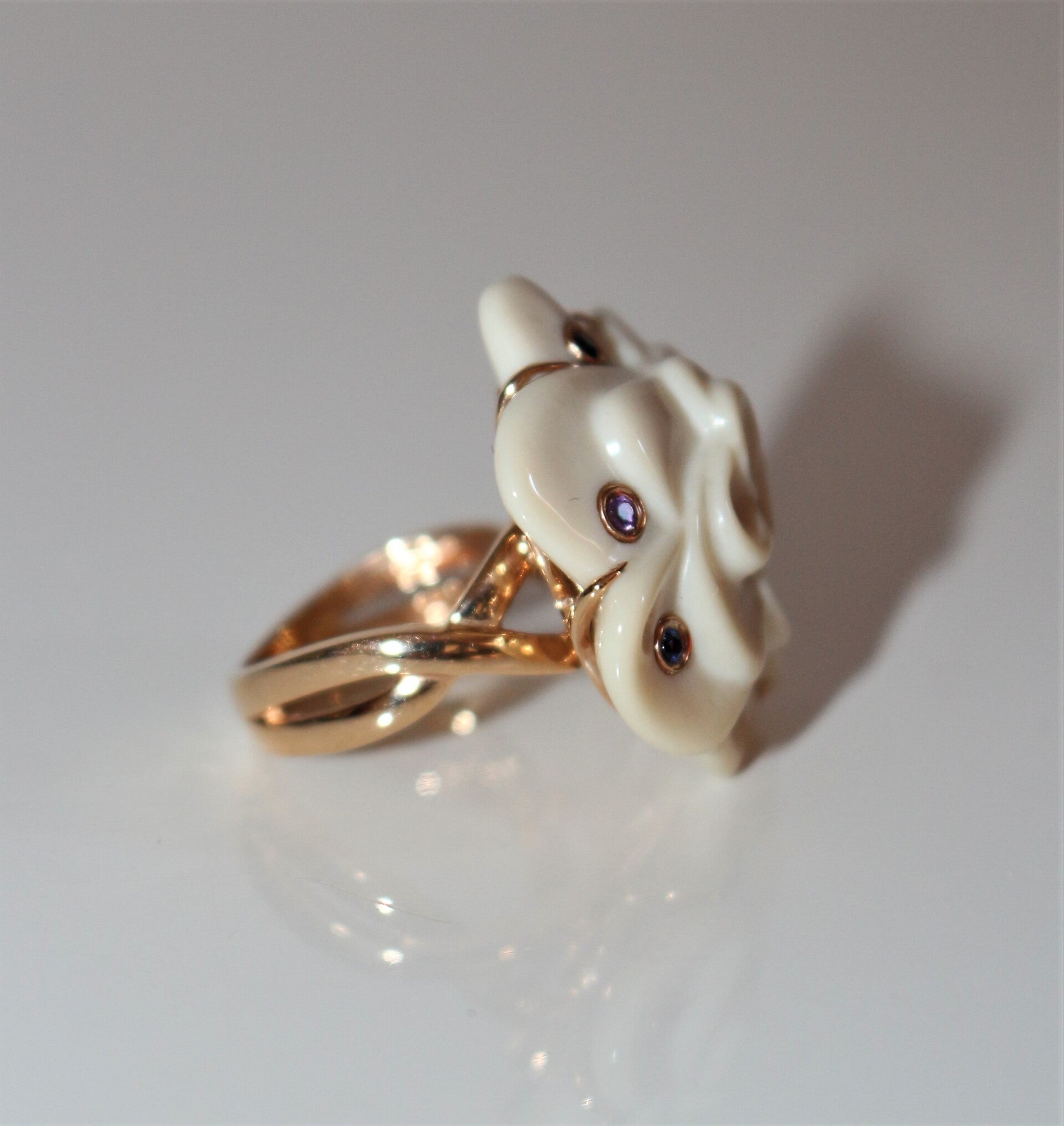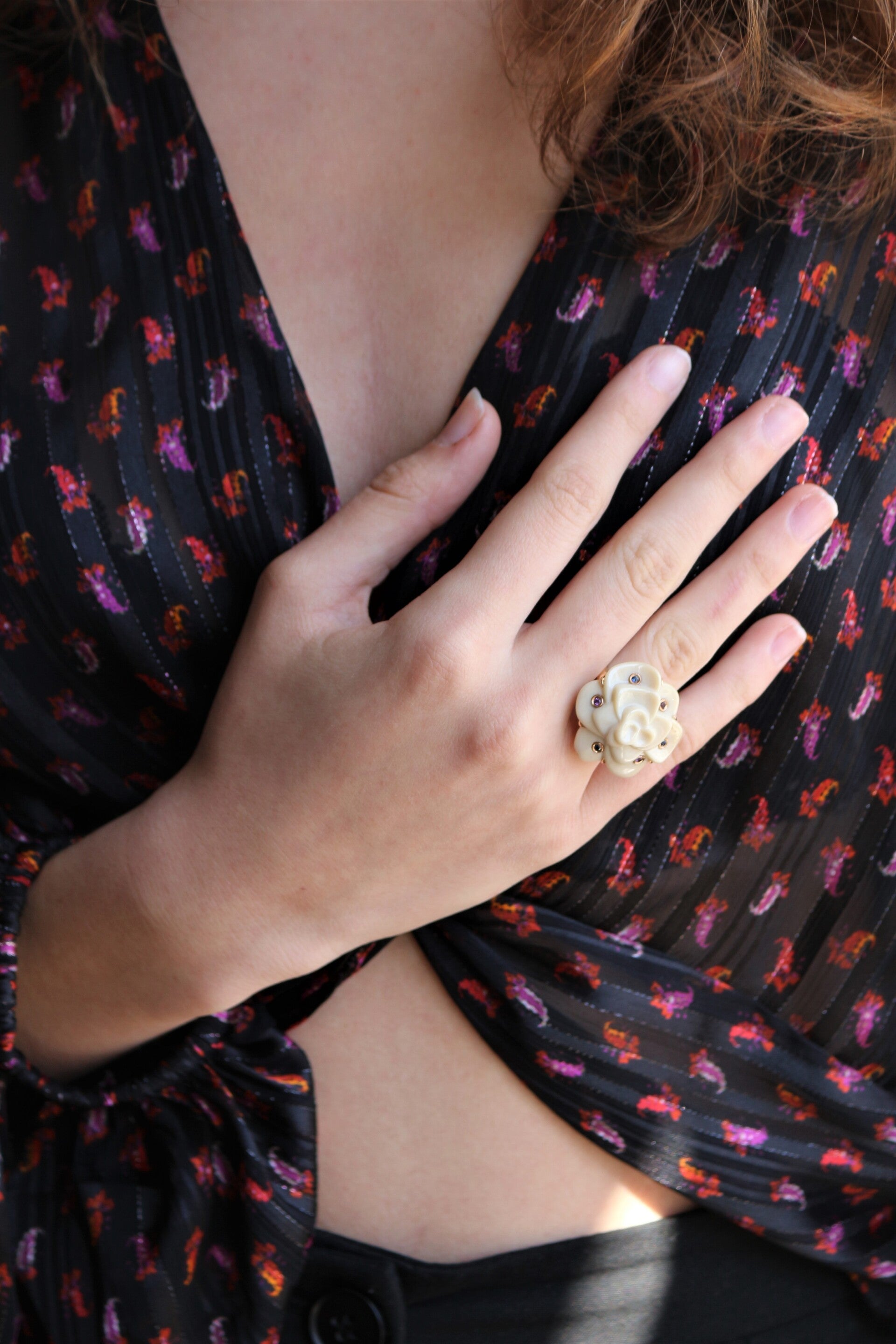 Bague en or rose 18k (750/1000e) sertie d'une opale blanche opaque : cacholong, représentant un camélia, serti de 3 petits saphirs et 3 améthystes en serti clos alternant, rappelant les modèles Chanel.