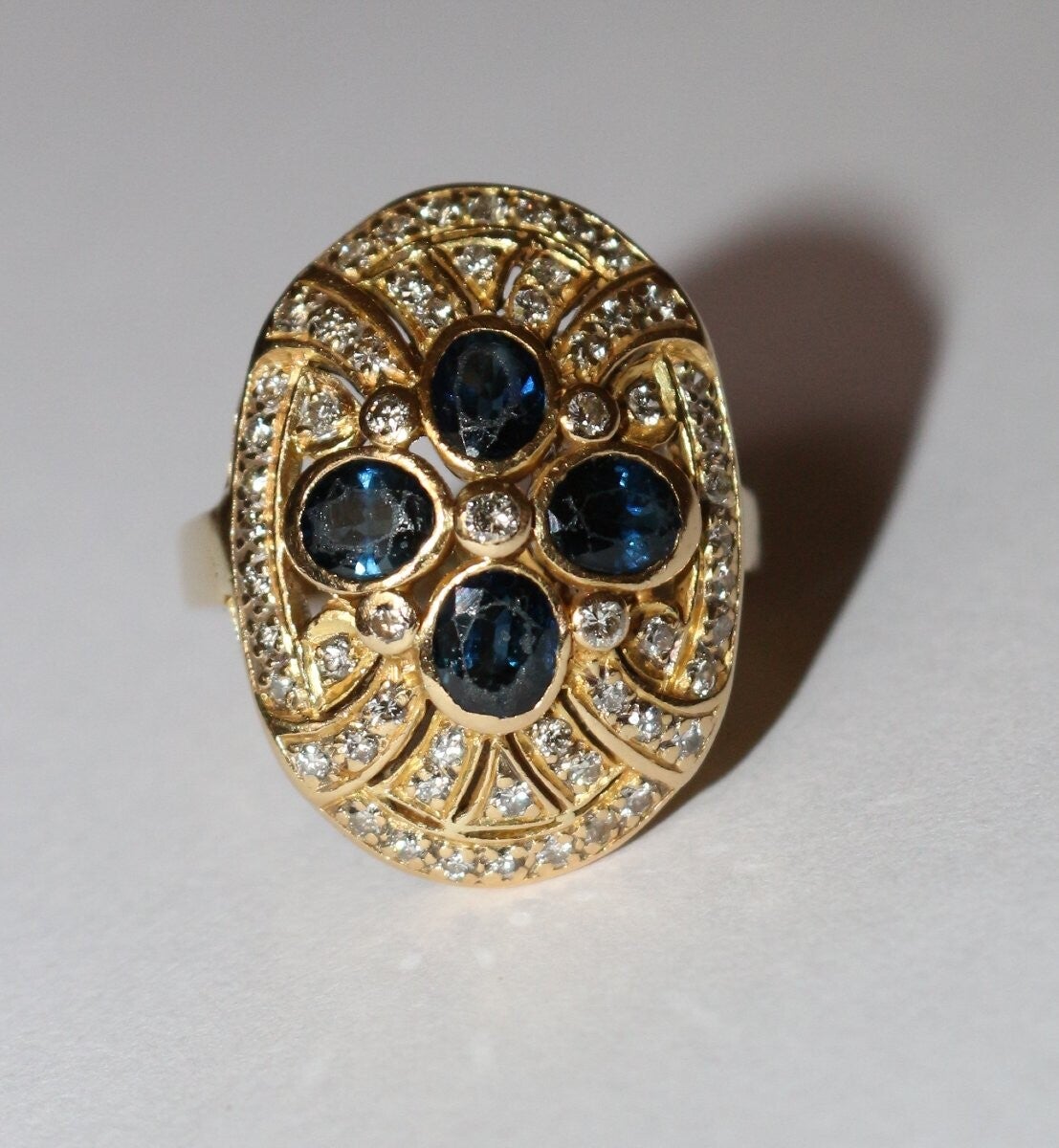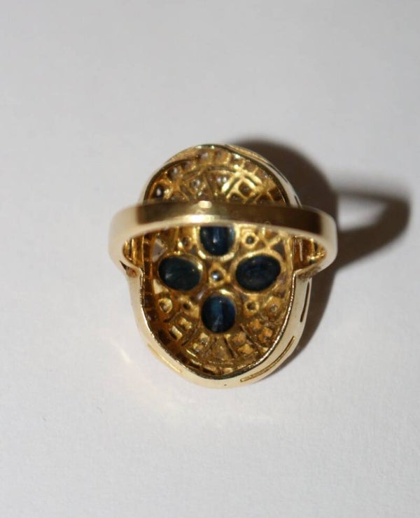 Bague à chaton ovale rayonnant en or jaune 750/1000e (18 carats), sertie clos de 4 saphirs ovales facettés (pour un total de 0.96 ct) et de diamants taille brillant. Beau travail ajouré des années 80-90.
