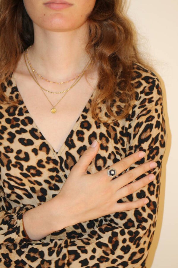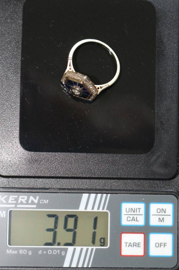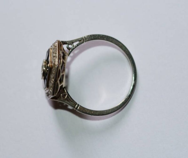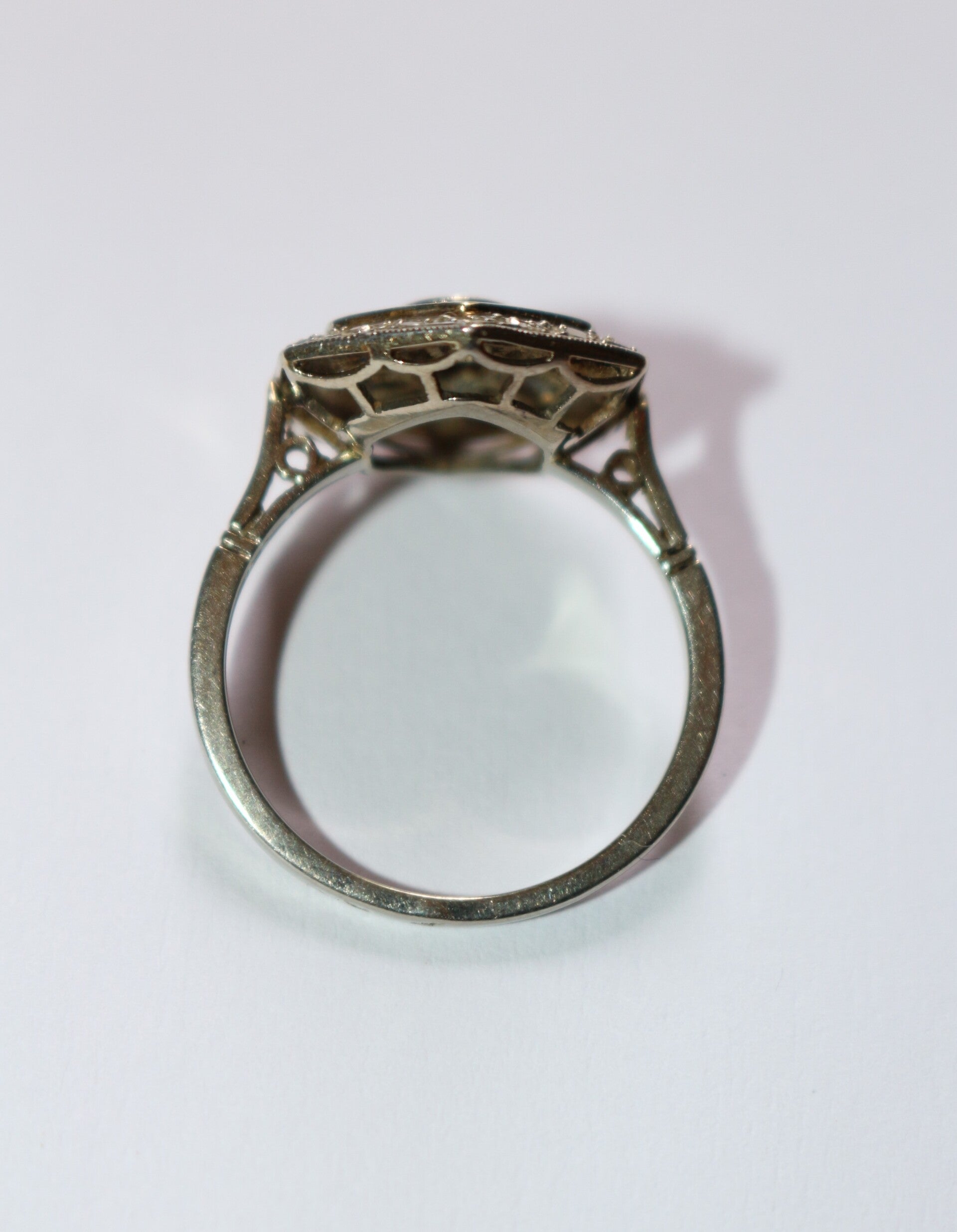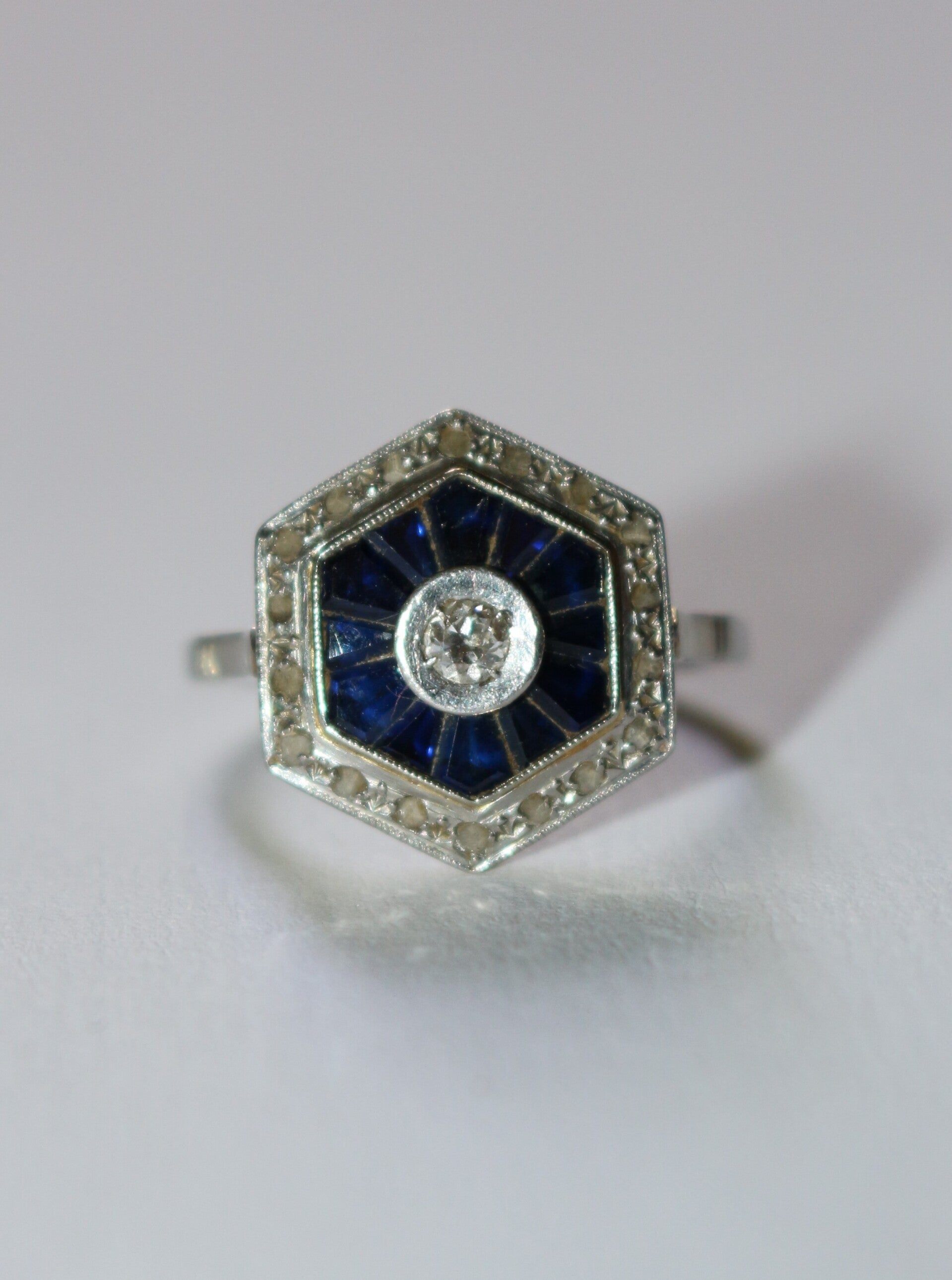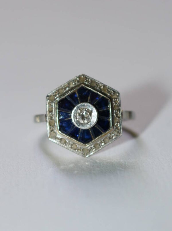 Bague de style Art Déco en or blanc 750/1000° et platine min 850/1000° de forme hexagonale présentant un diamant central taille brillant d'environ 0.05 ct (2.5 mm) en serti griffes, entouré de 12 petits saphirs rayonnants et d'une frise de petits diamants taille rose.