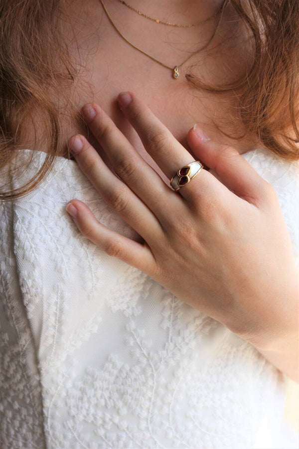 Bague MAUBOUSSIN "Nadia" années 90 en or jaune 750/1000e (18k) ornée de plaques de nacre, sertie de 2 rubis taille poire en serti clos, mesurant 6 / 4 mm et 5,5 / 3,5 mm