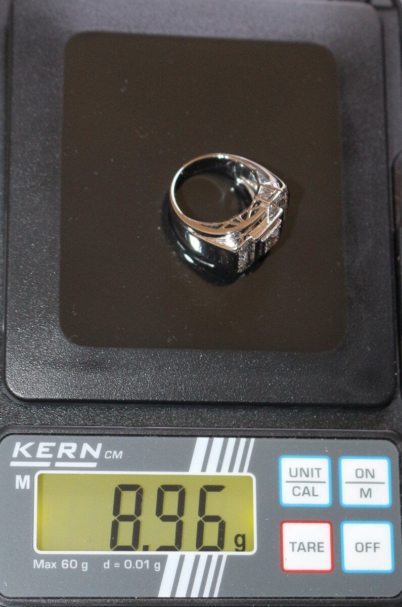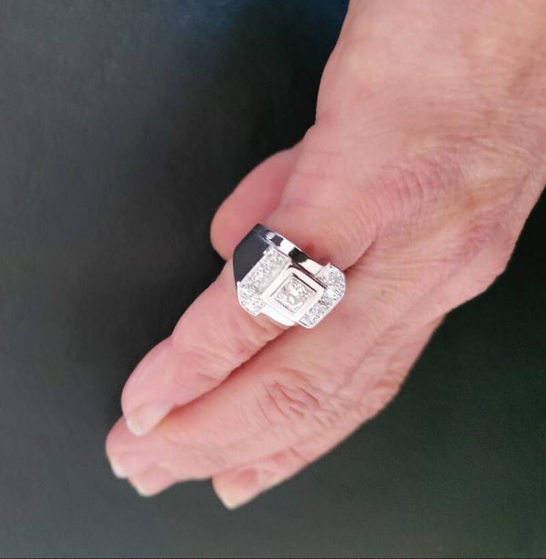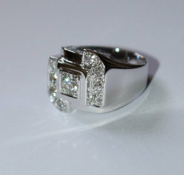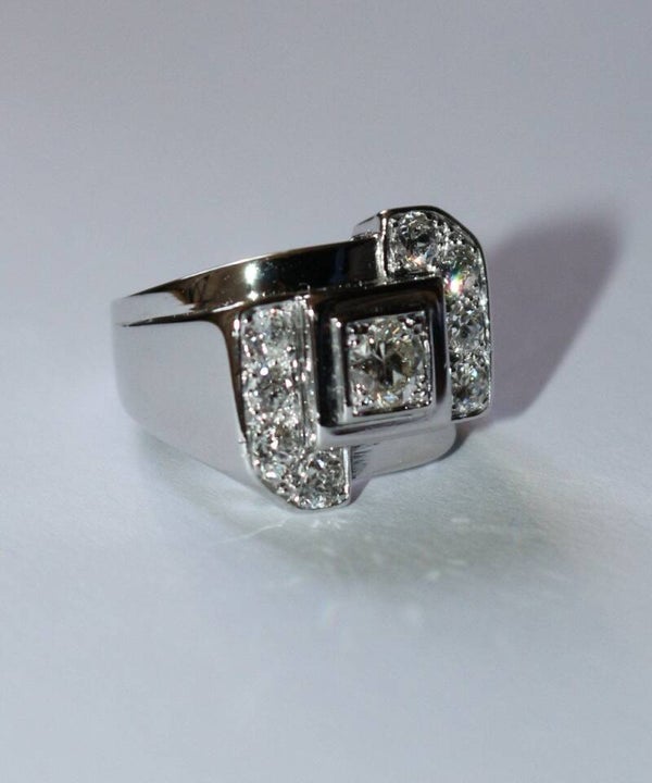 Bague chevalière Art Déco, années 1930, en or blanc 750/1000e (18 carats) et platine, présentant un motif géométrique décalé serti de 9 diamants taille ancienne et demi-taille.