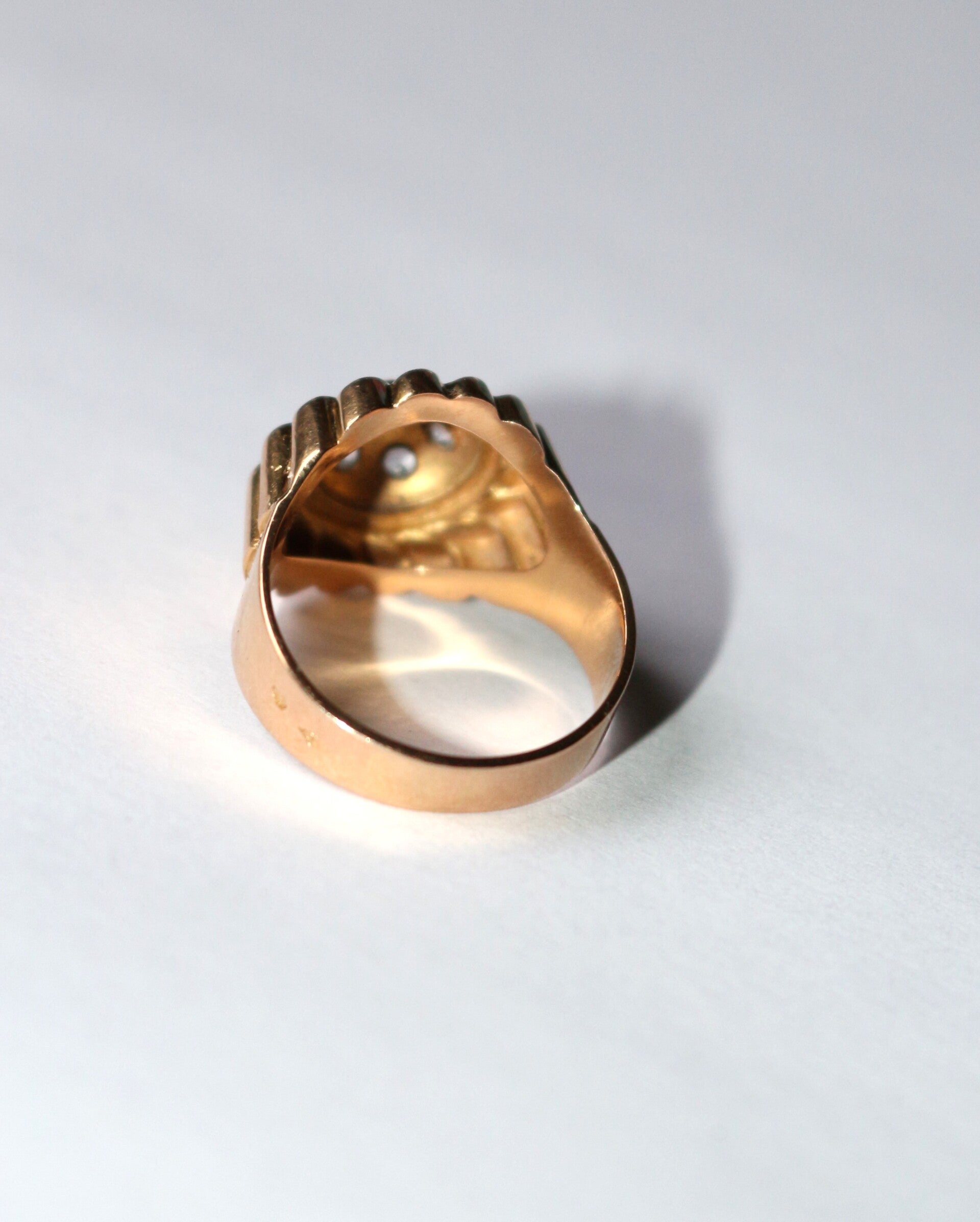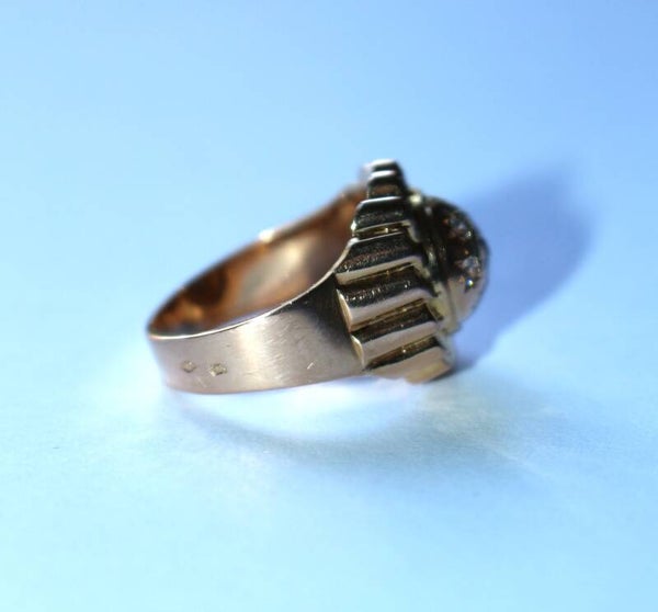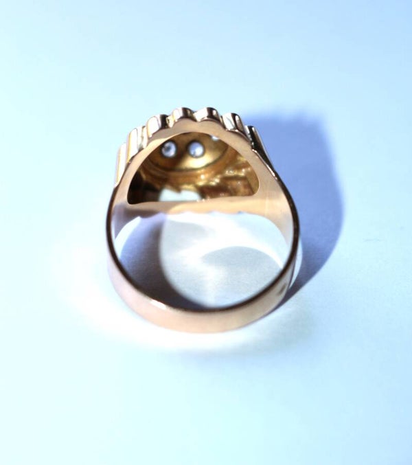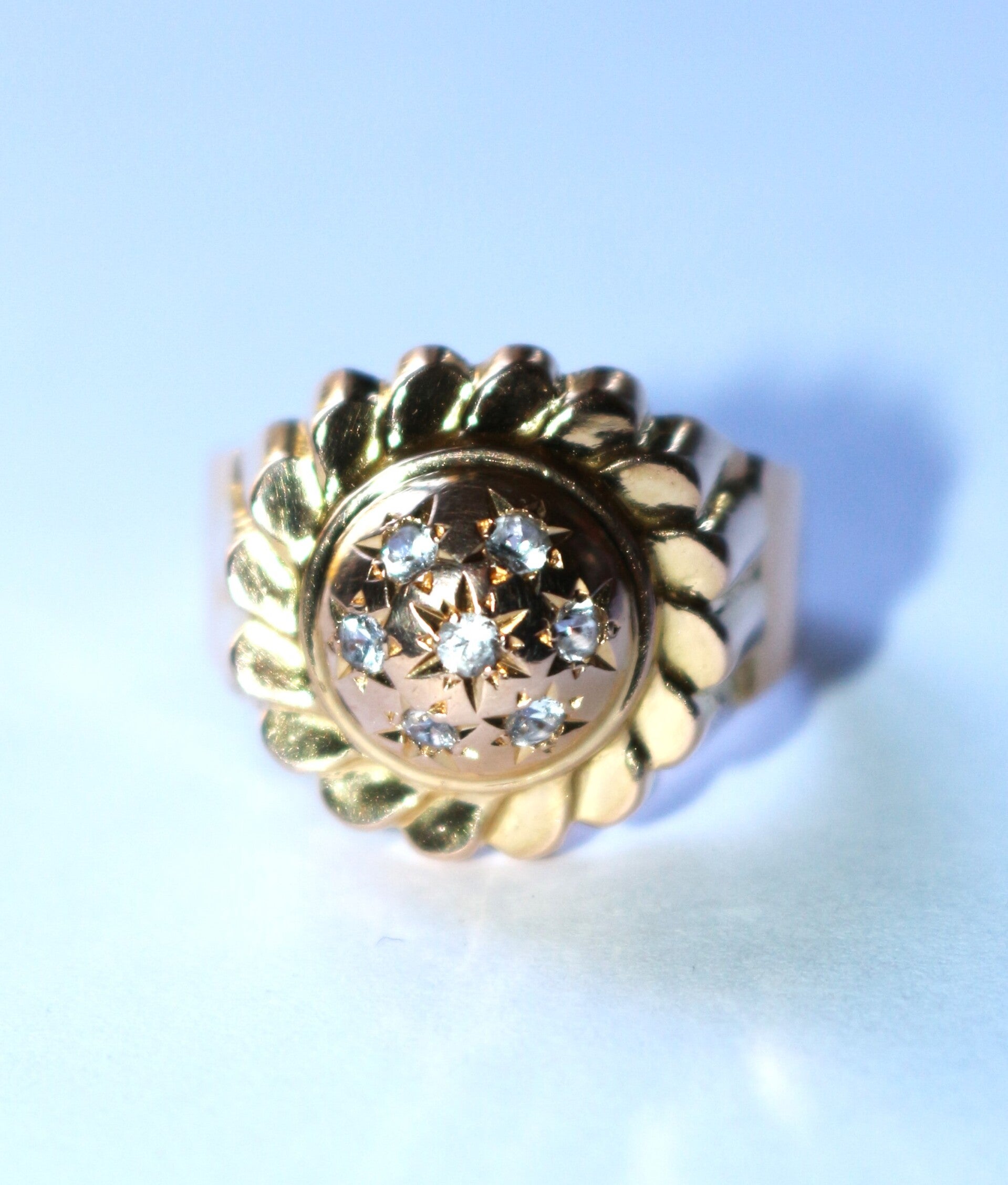 Bague Dôme Soleil rayonnant, en or jaune 750/1000e (18 carats) Rétro, années 50, ponctuée de 7 petites pierres blanches, imitations diamant taille brillant, insérées dans des motifs étoilés.