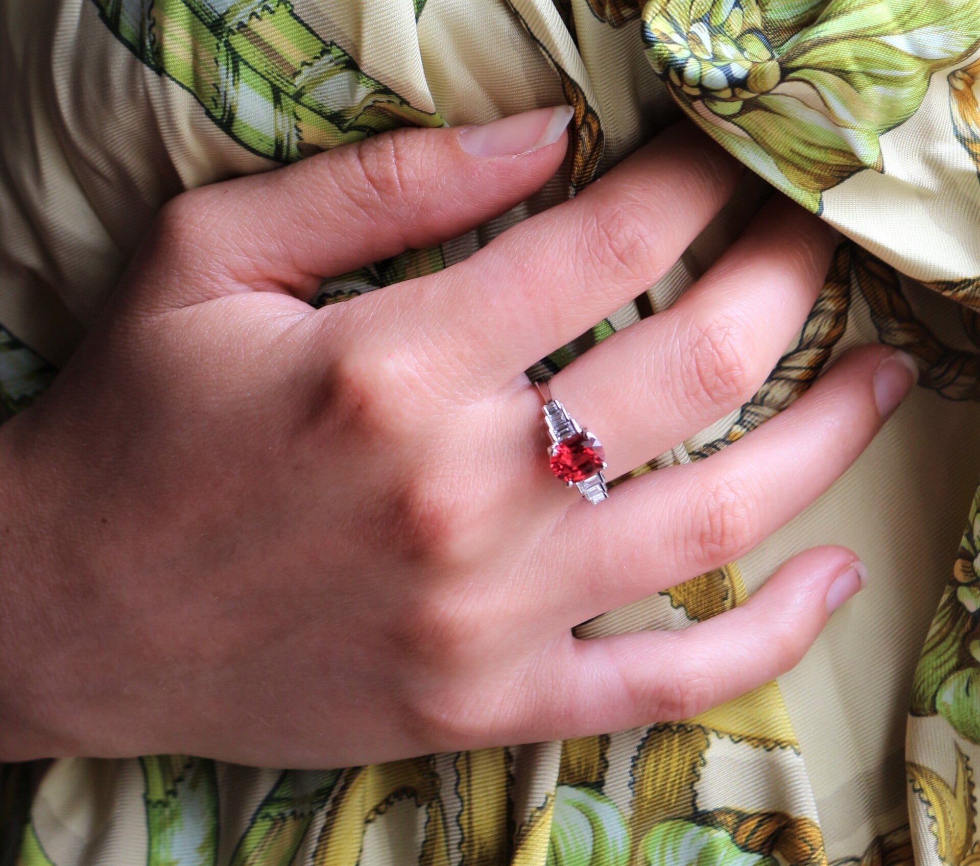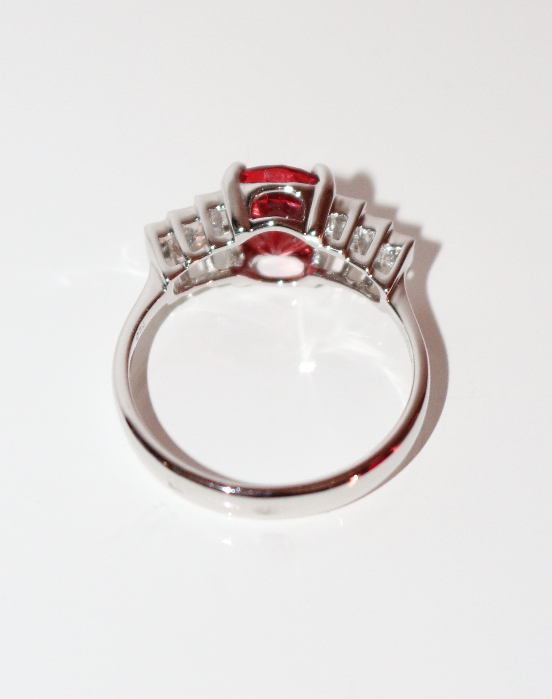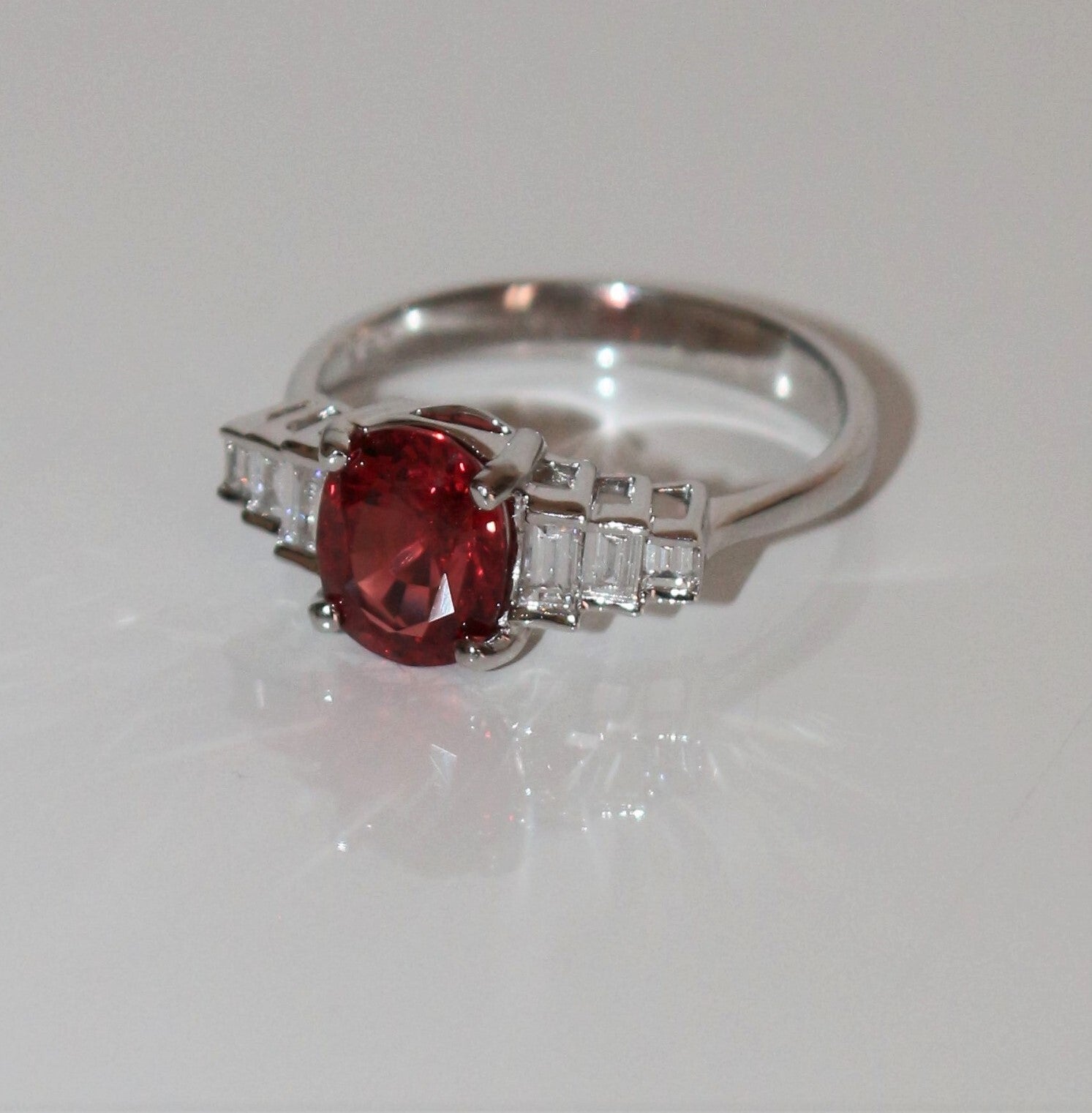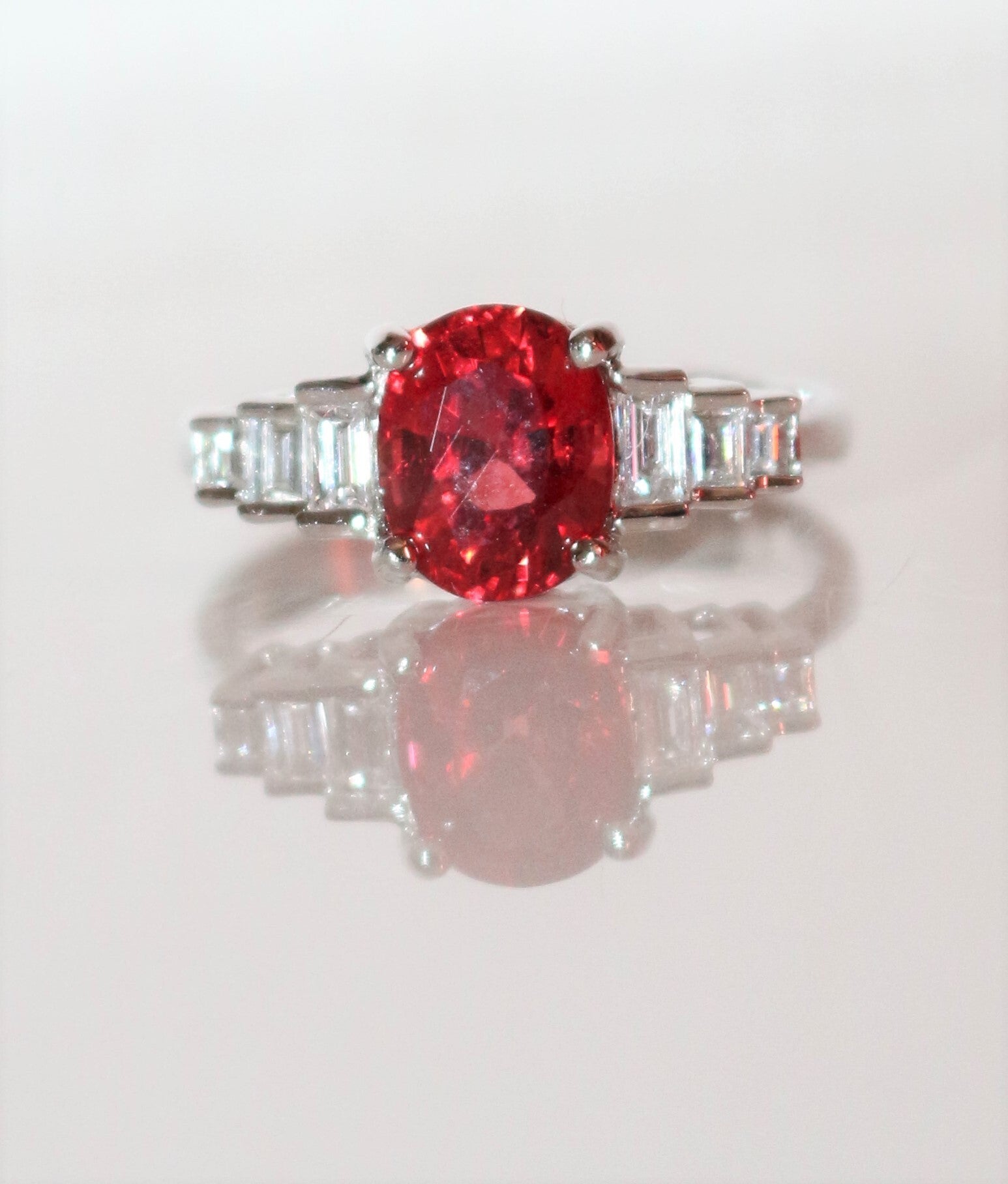 Bague en or blanc 750/1000e (18 cts) sertie d'un spinelle rouge-orange naturel ovale de 1.92 ct, épaulé de 3 petits diamants baguette de chaque côté (3mm/2mm, 2.5mm/1.5mm, 2mm/1mm, couleur G, VS1). Certificat de laboratoire complet : certifiant spinelle naturel.
