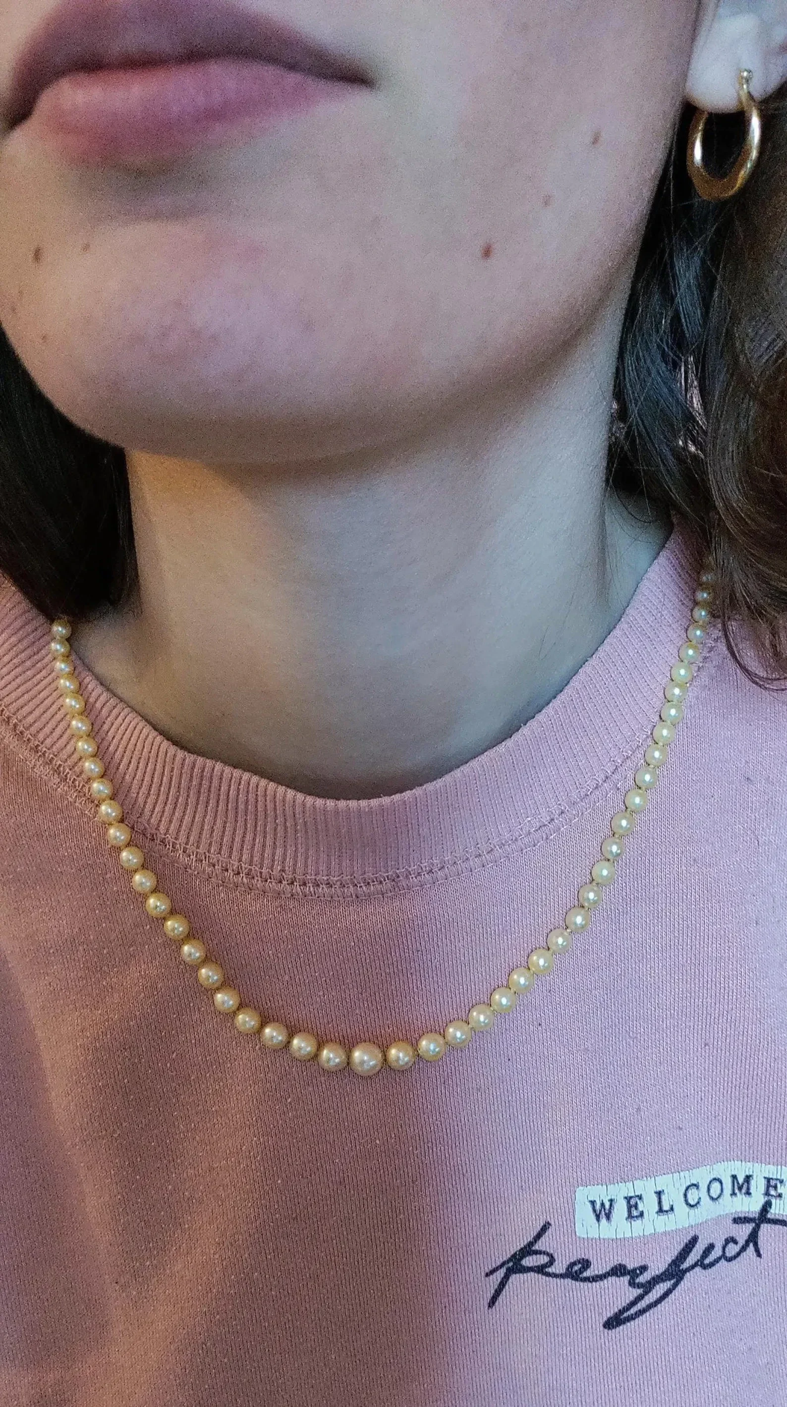 Fin collier de 90 perles de culture en chute, fermoir et chaînette de sécurité en or jaune 750/000e (18 carats)