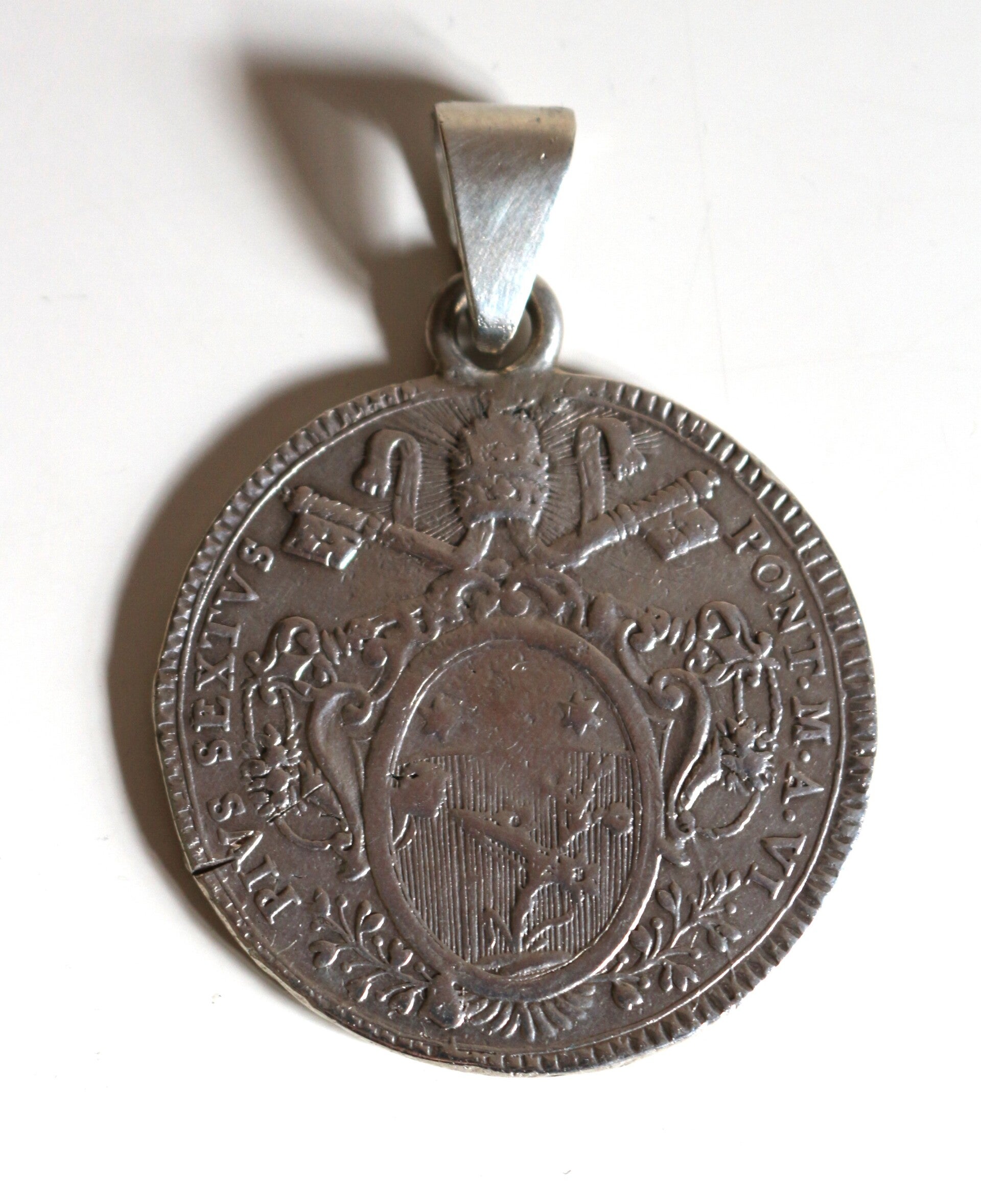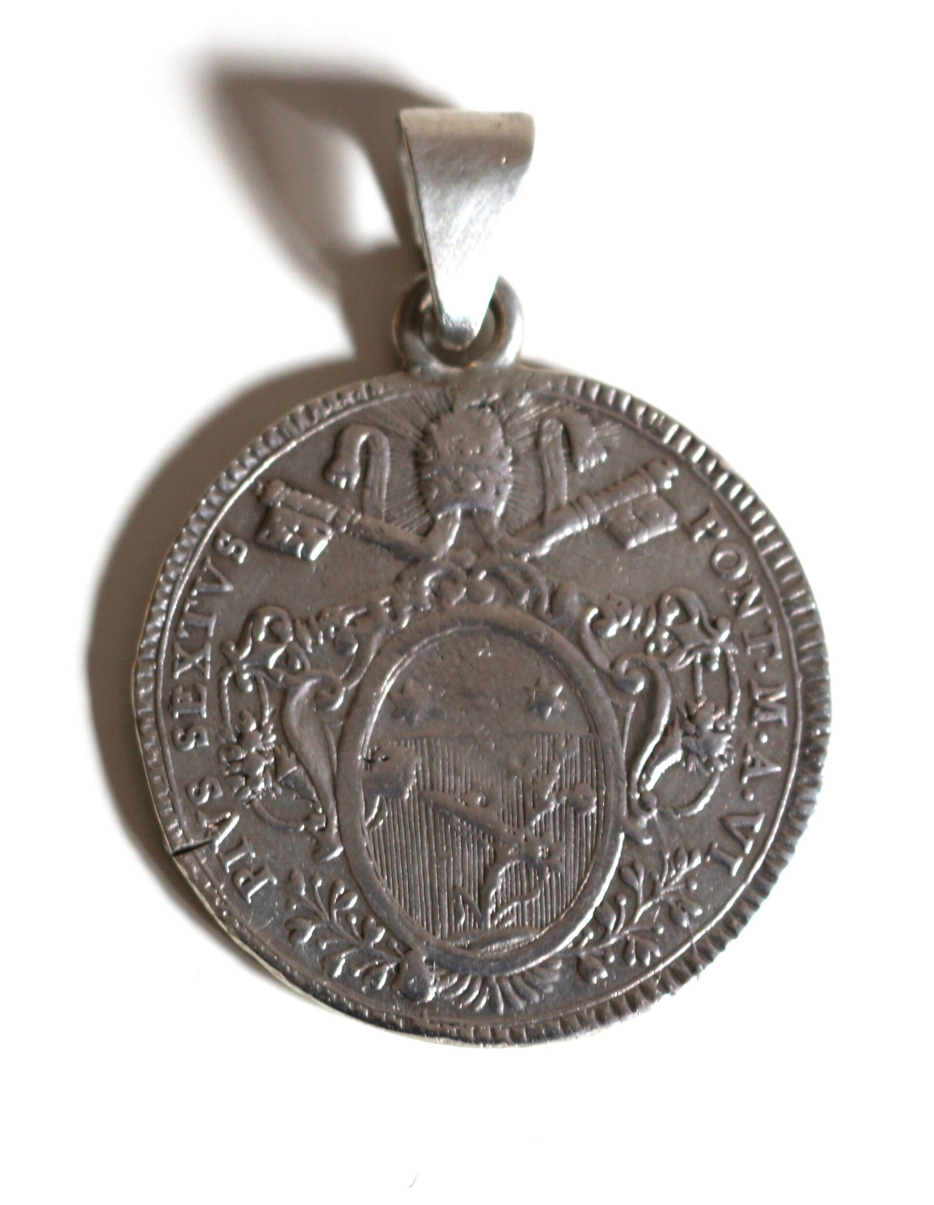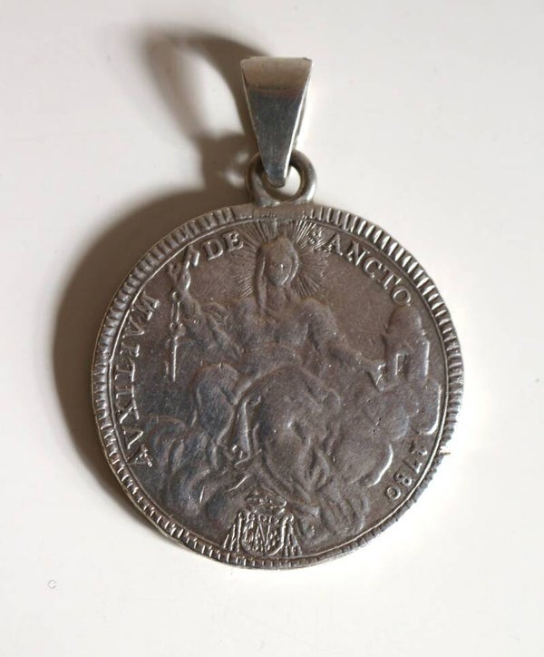 Collier en argent présentant en médaillon une pièce en argent 1 scudo Pie VI, 1780, an VI. Avers : armoiries ovales du Pape, écriture latine : PIVS SEXTVS PONT M A VI et revers : Sainte Mère l'Eglise assise sur un nuage, écriture latine : AVXILIVM DE SANCTO 1780. Atelier d'Ancône, Italie. Etats Pontificaux.