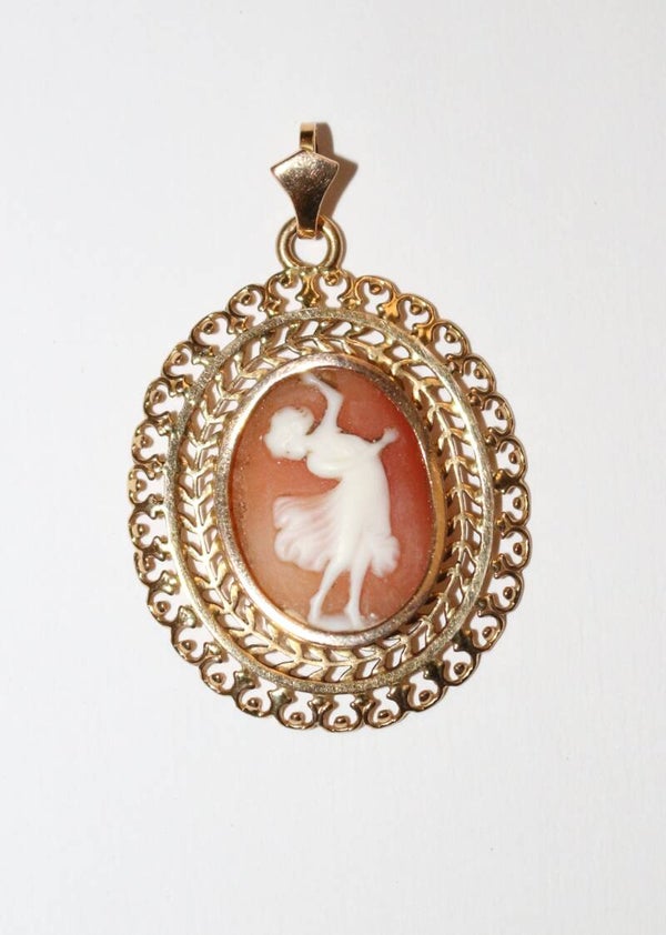 Pendentif en or jaune 750/1000e (18 carats) serti d'un camée coquille à décor d'une danseuse à l'antique dans un entourage ajouré d'une frise de feuilles de laurier. XIXe siècle. Epoque Napoléon III
