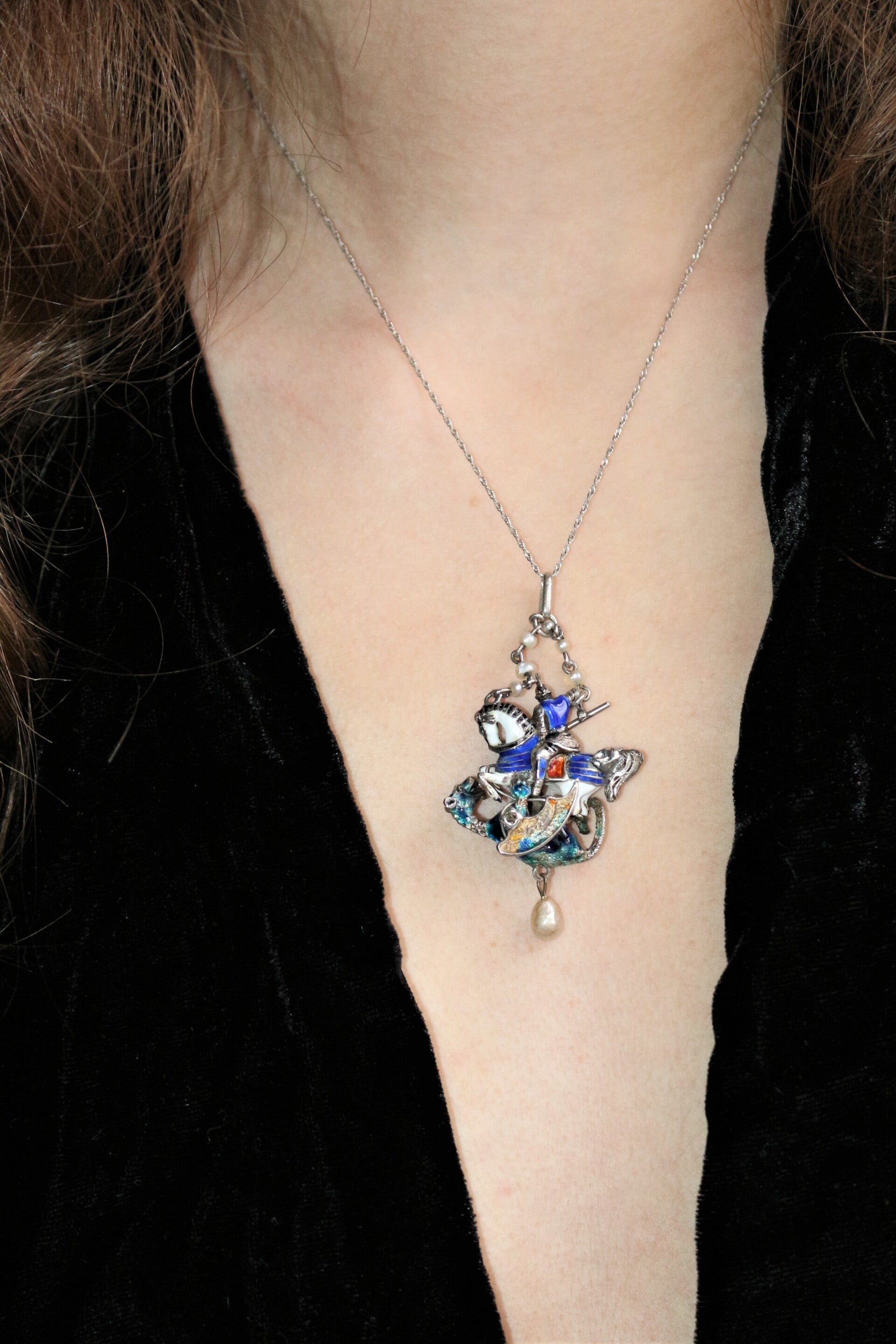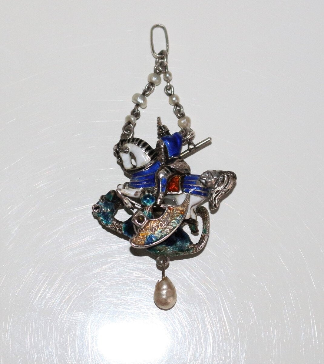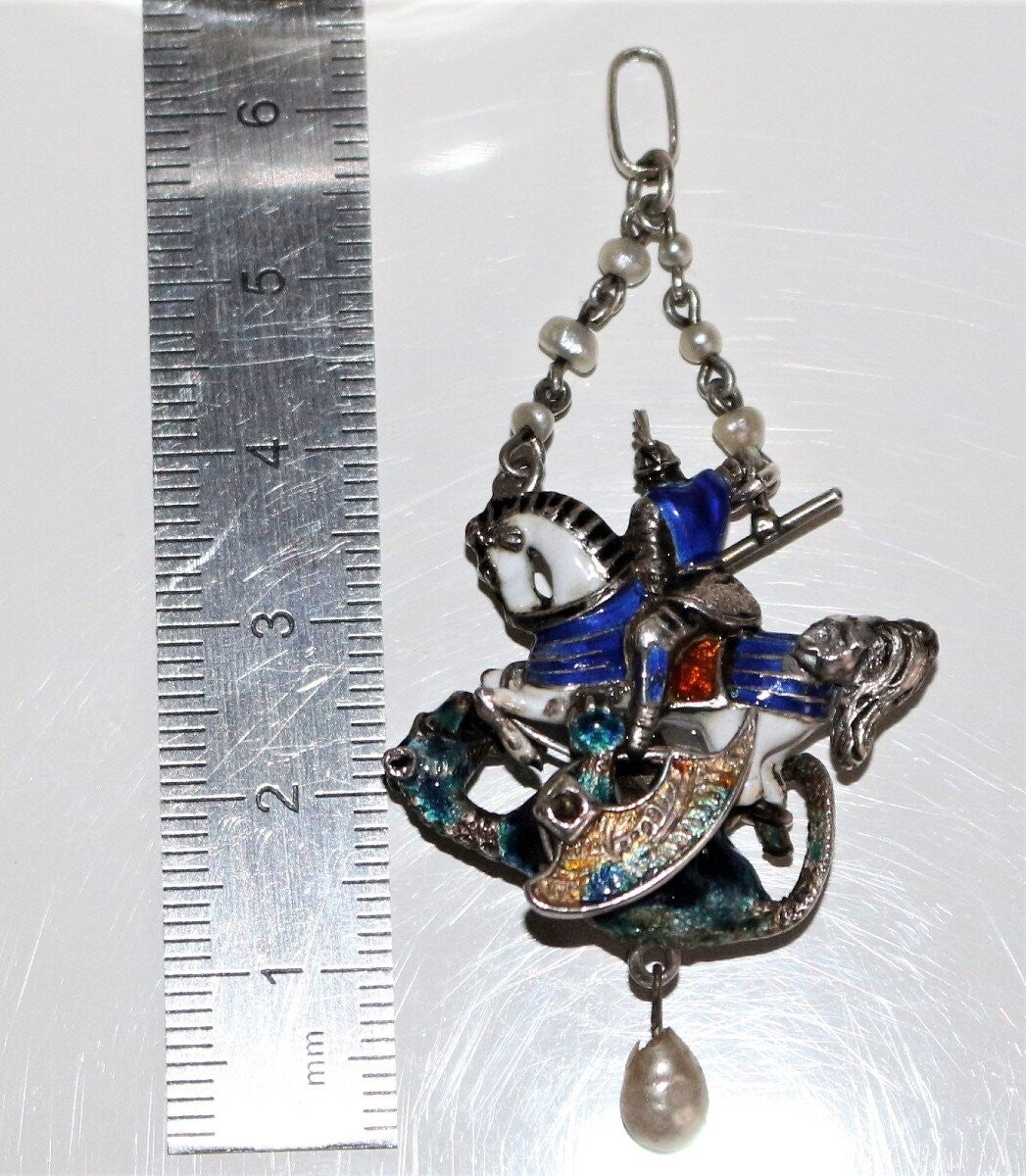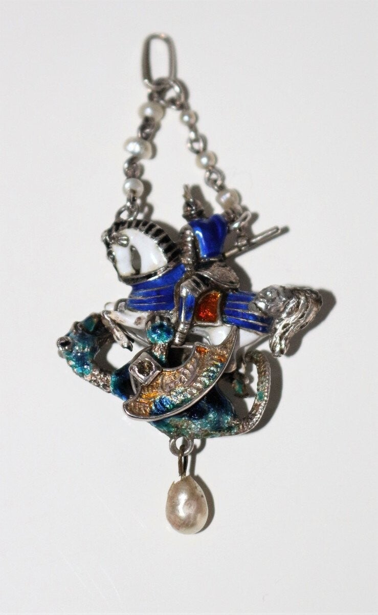 Pendentif en argent émaillé multicolore figurant Saint Georges terrassant le dragon, de style Renaissance, époque XIXe. Petites perles et roses. Travail probablement austro-hongrois.