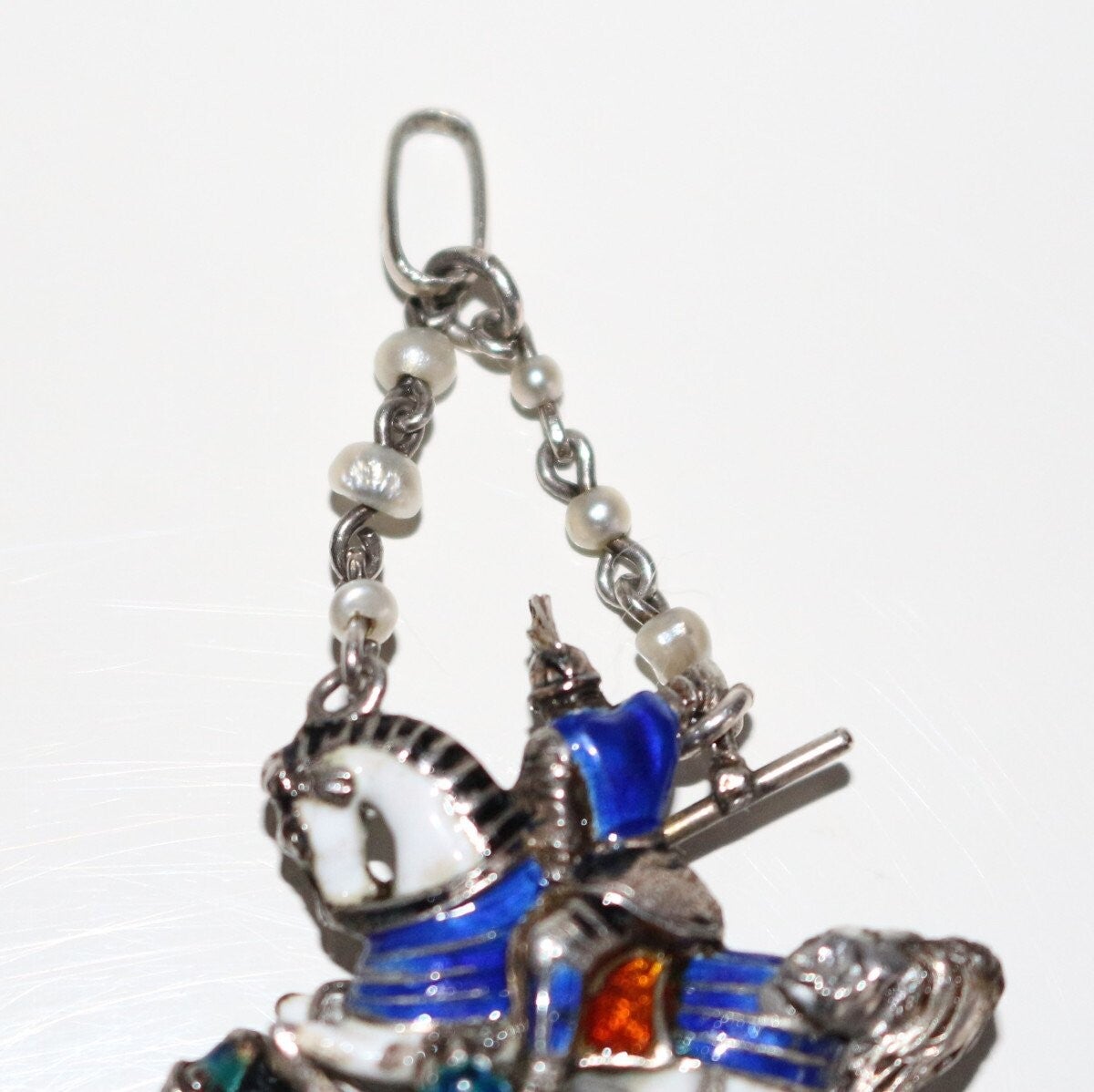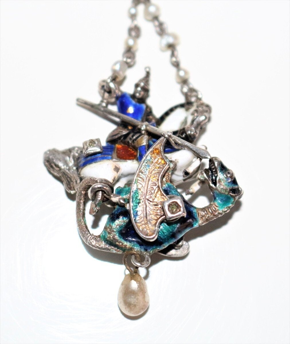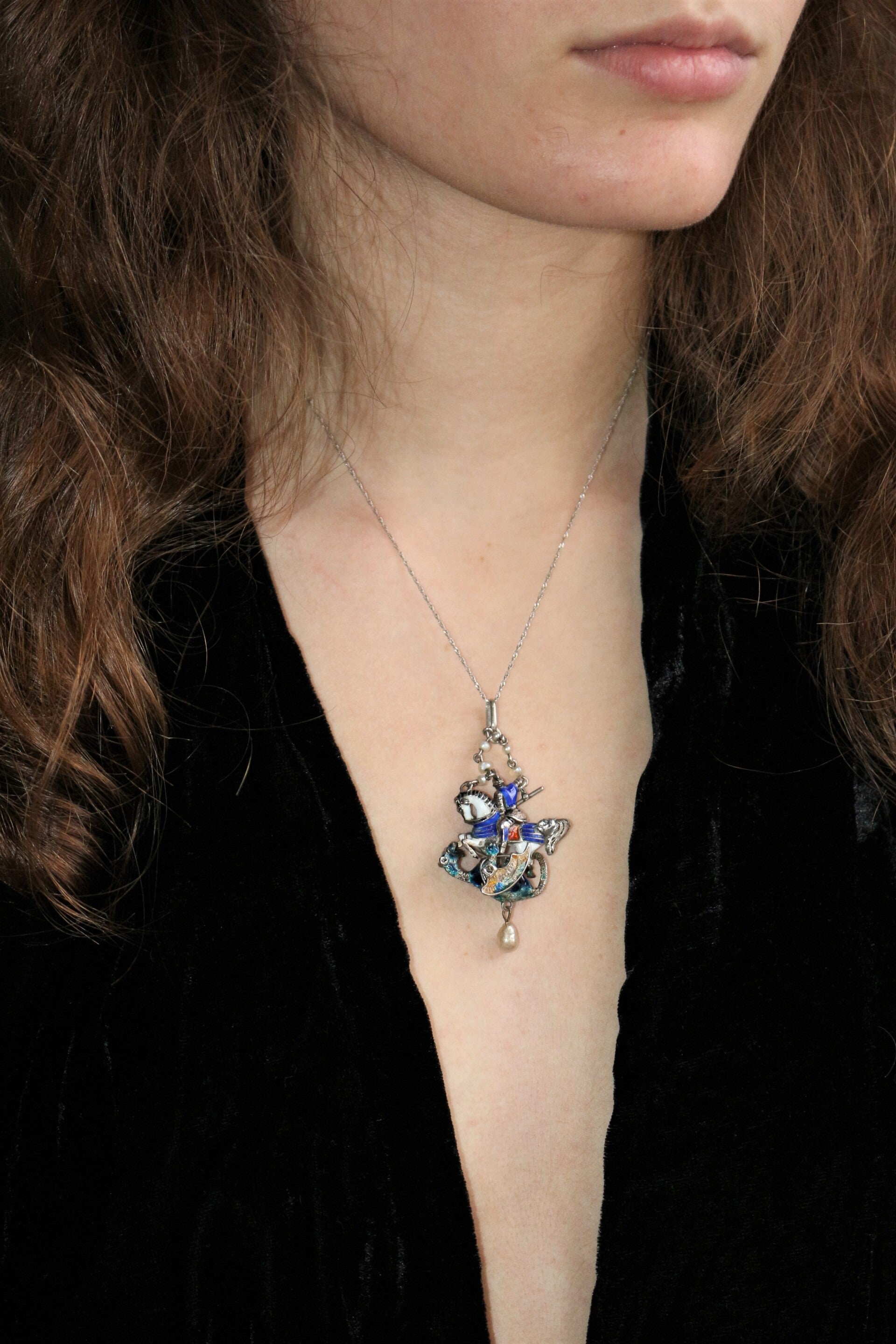 Pendentif en argent émaillé multicolore figurant Saint Georges terrassant le dragon, de style Renaissance, époque XIXe. Petites perles et roses. Travail probablement austro-hongrois.