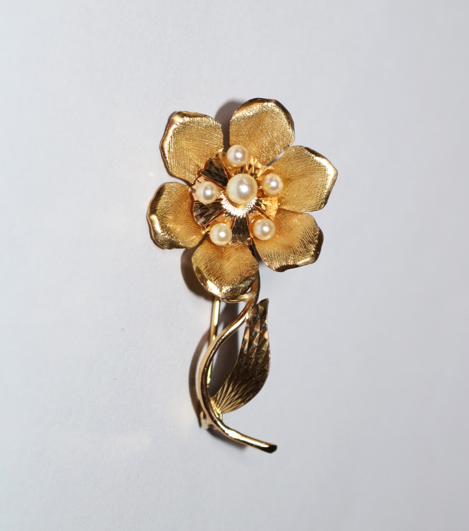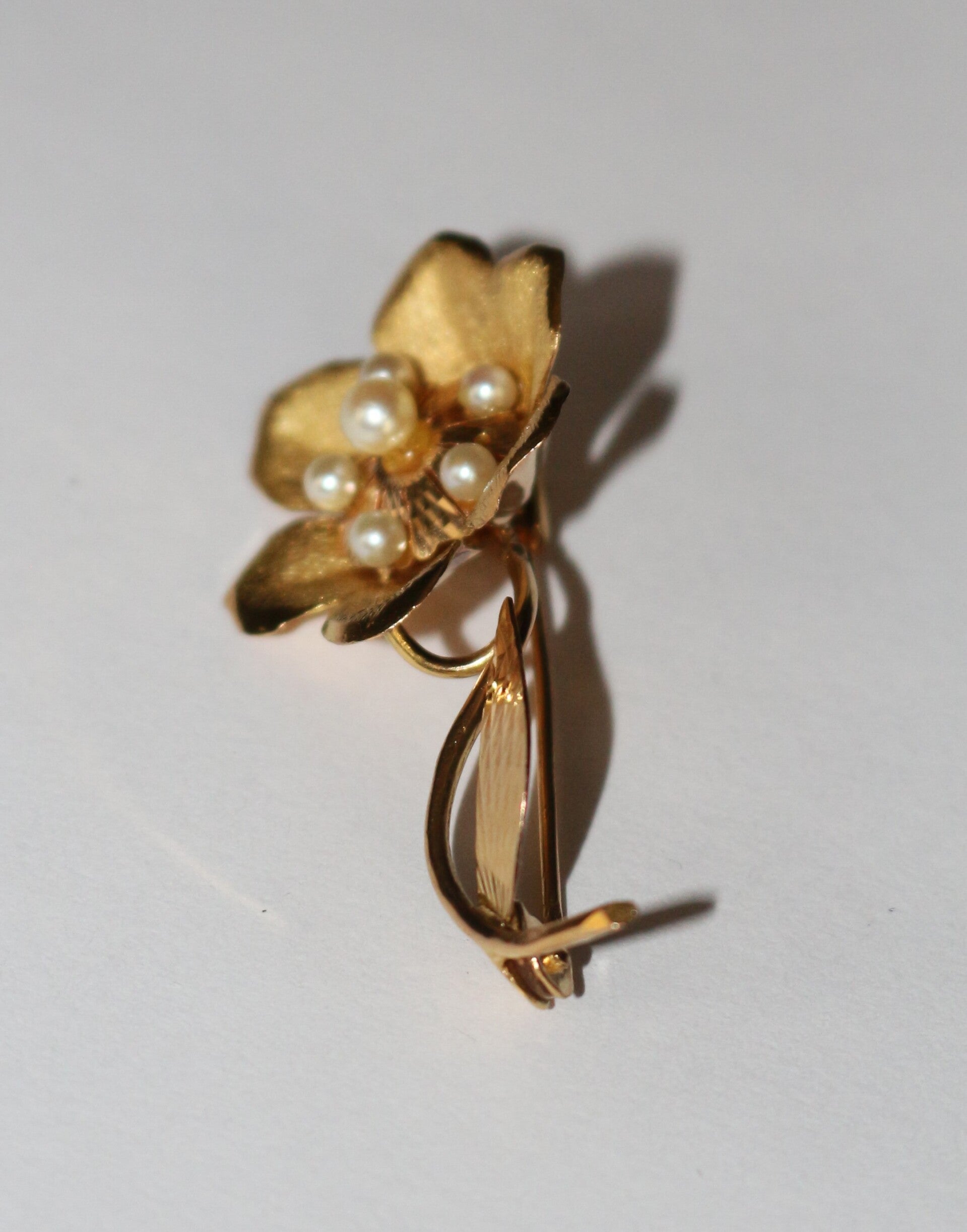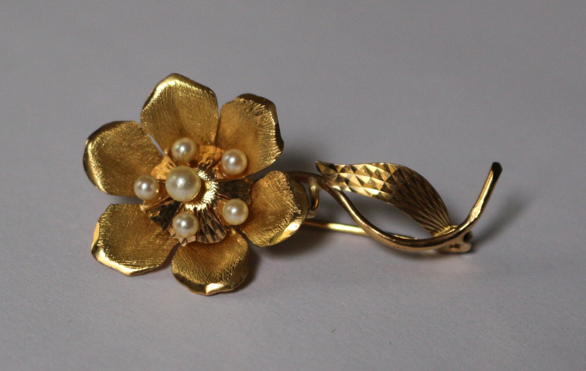 Broche fleur en or jaune 750/1000e (18 carats), ajouré, ciselé et amati, ornée de 6 petites perles de culture. Années 60
