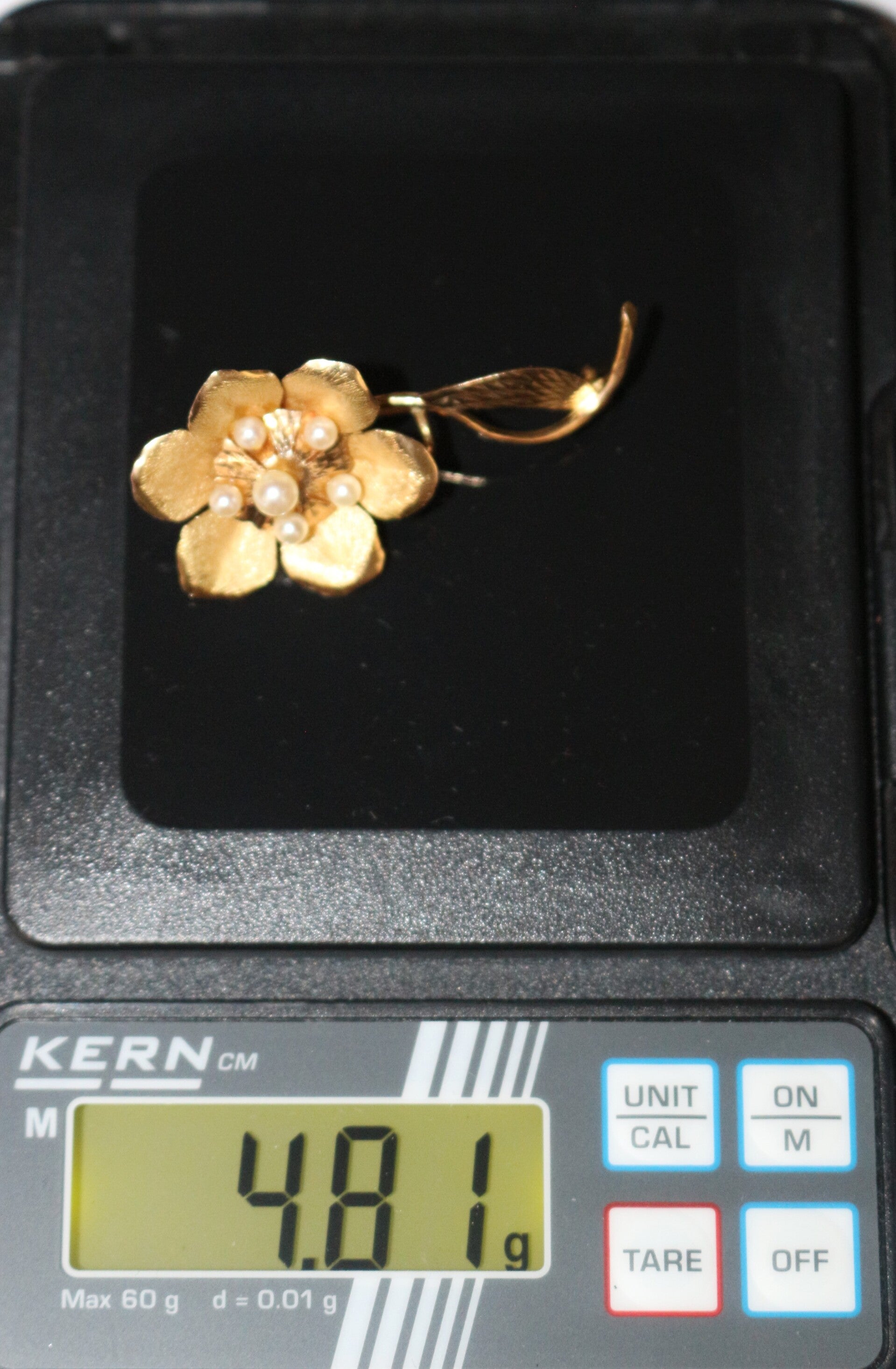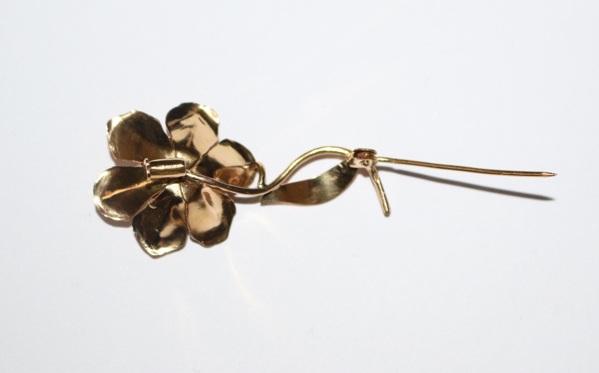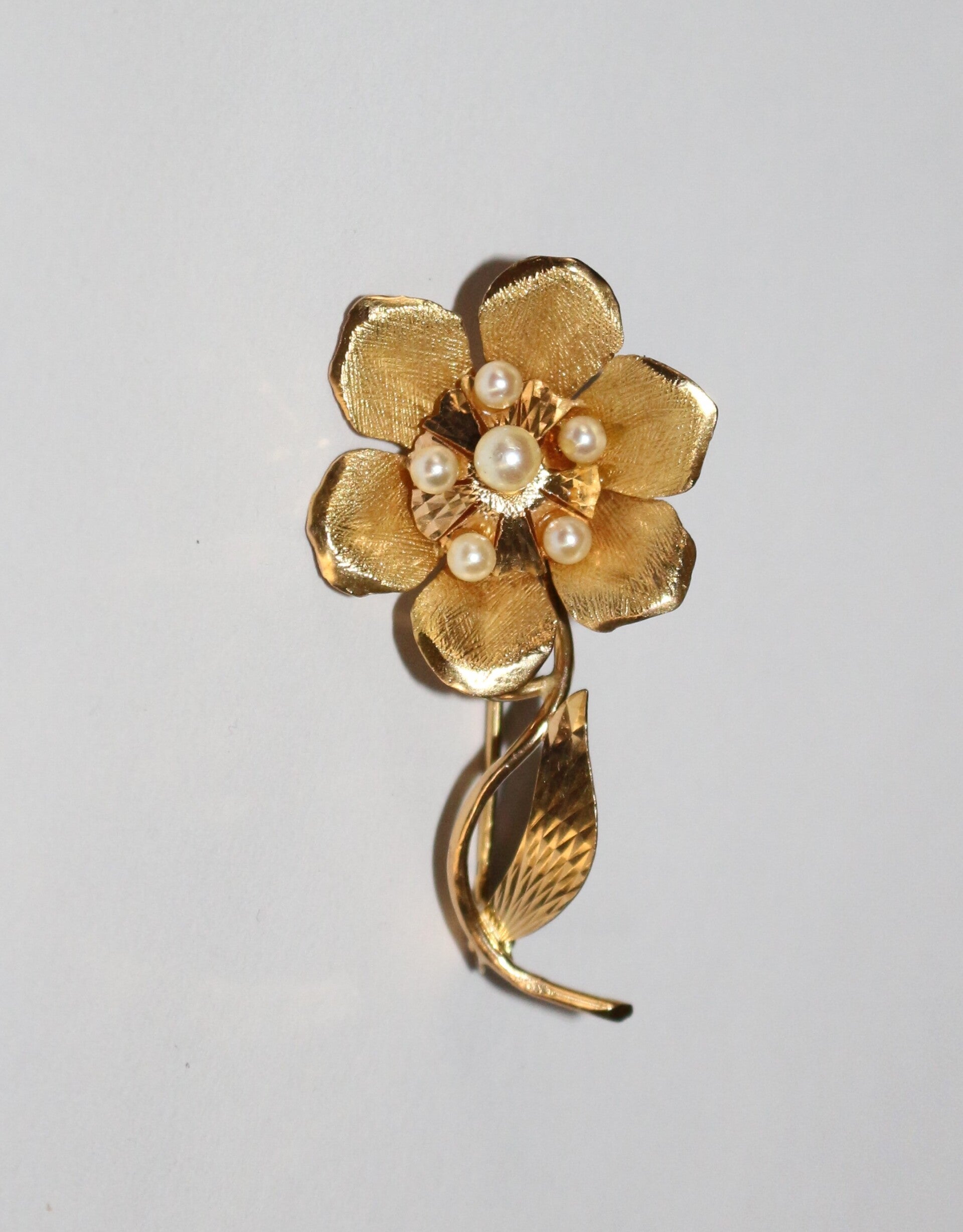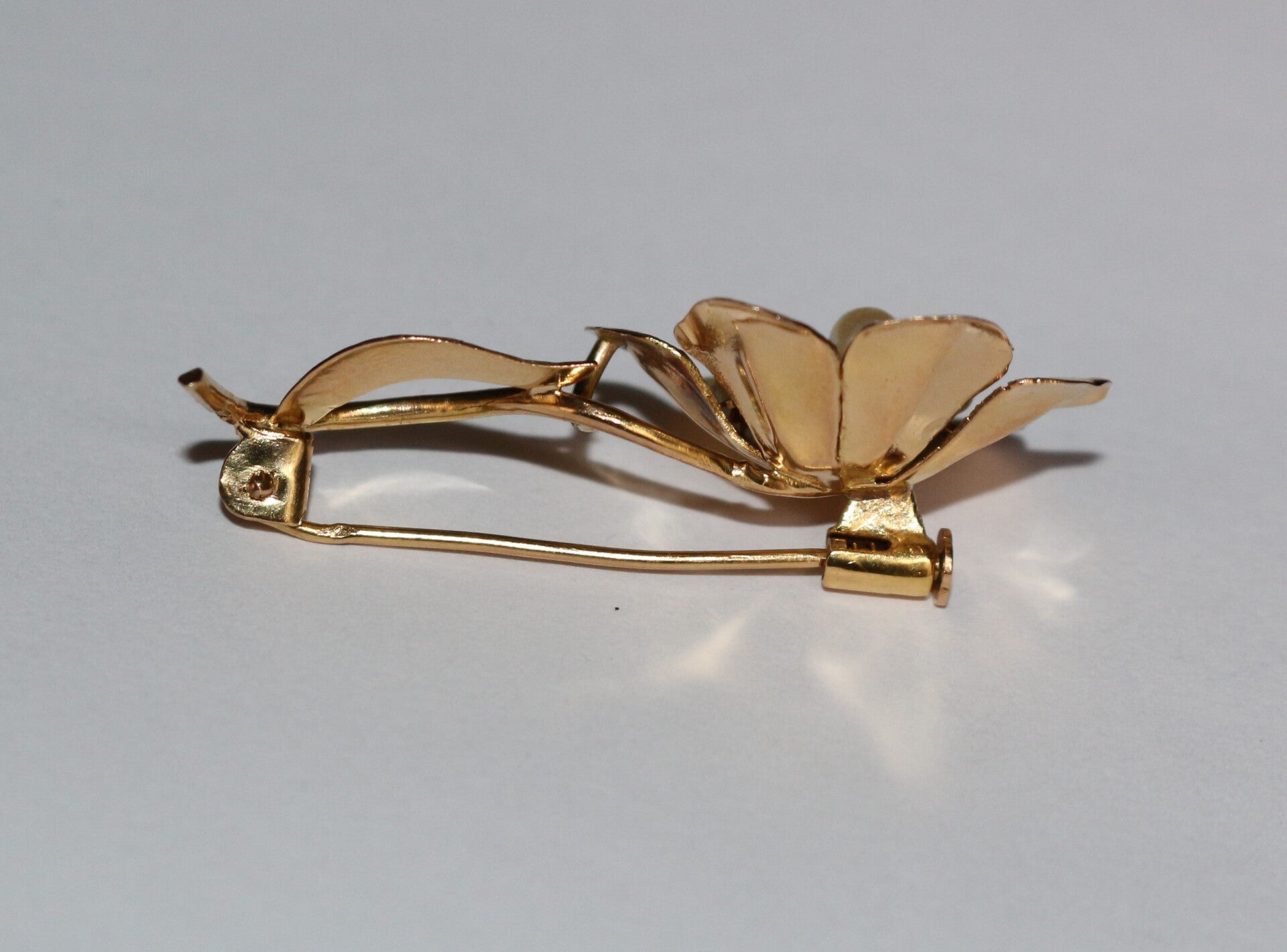Broche fleur en or jaune 750/1000e (18 carats), ajouré, ciselé et amati, ornée de 6 petites perles de culture. Années 60