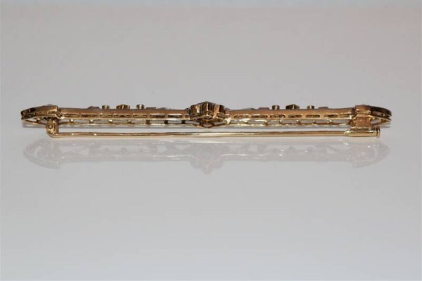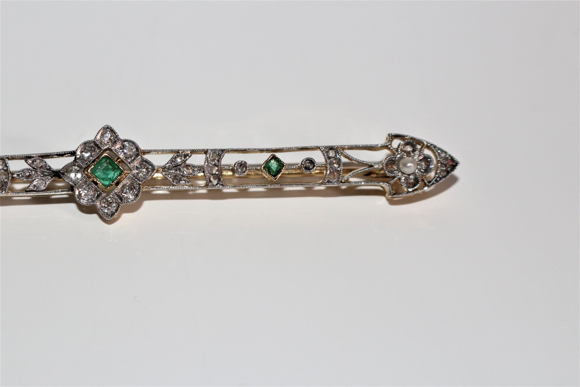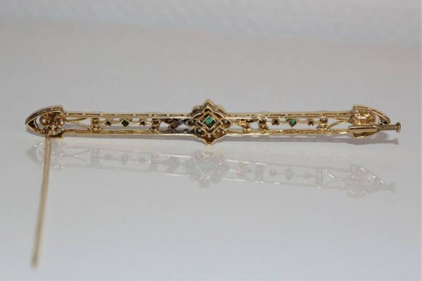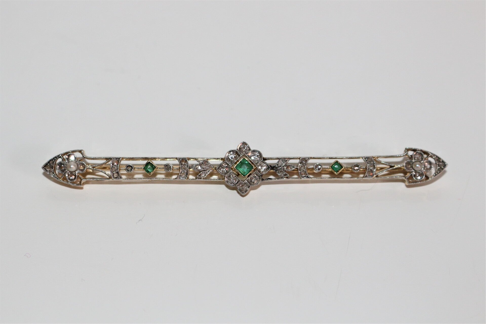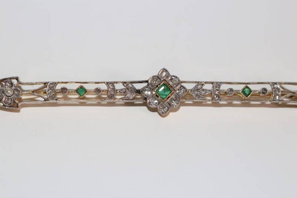 Broche-barrette début XXe, ajourée, Belle Epoque, en or jaune 750/1000e et or gris (18k), à motifs floraux et feuillagés très délicats, sertis d'émeraudes (3), de diamants taille ancienne et taille rose, et de petites perles blanches (2).
