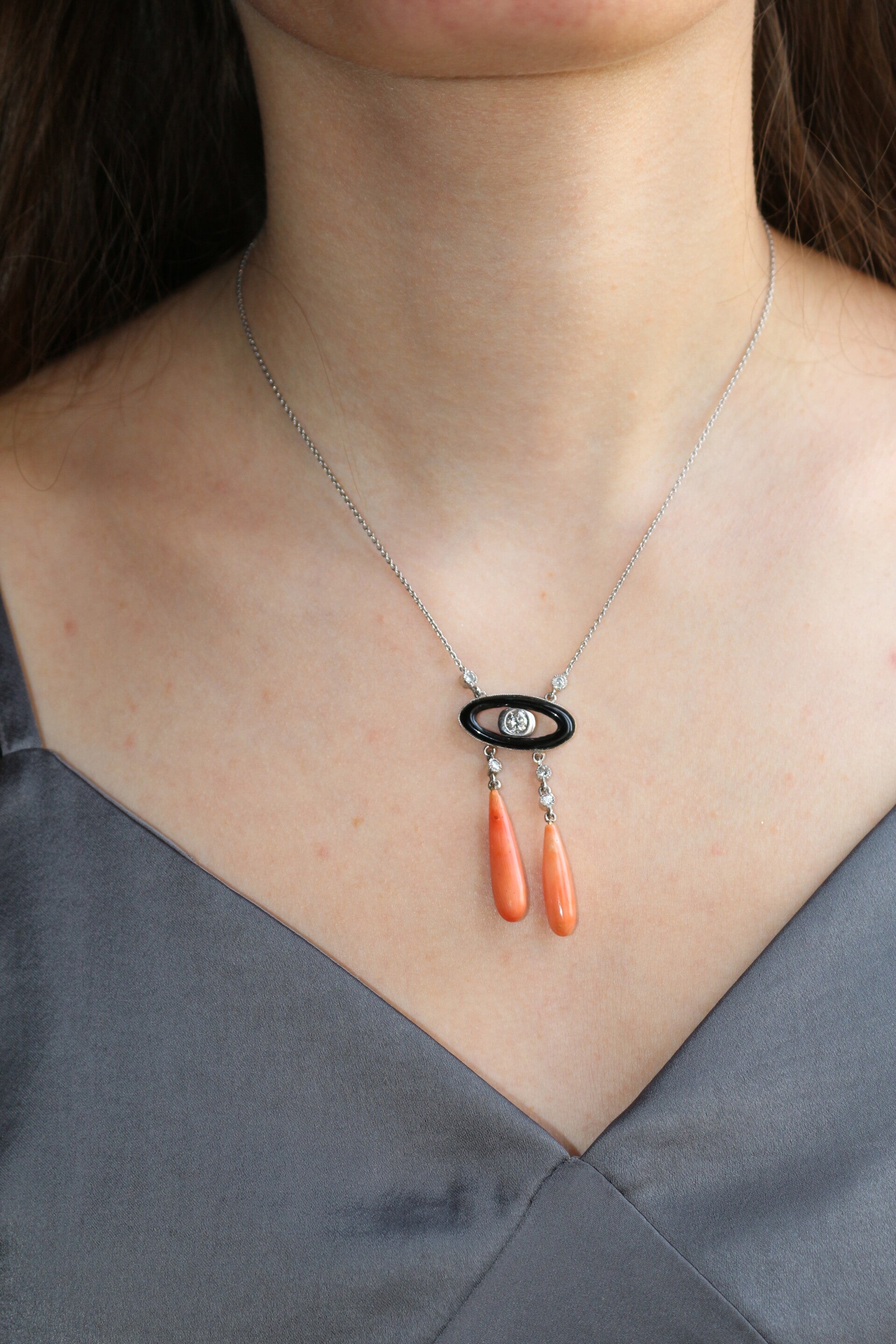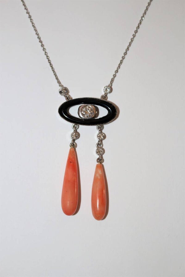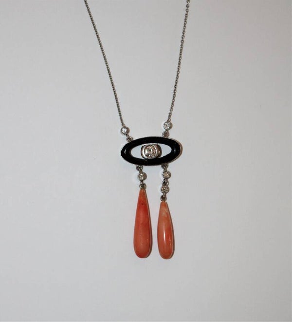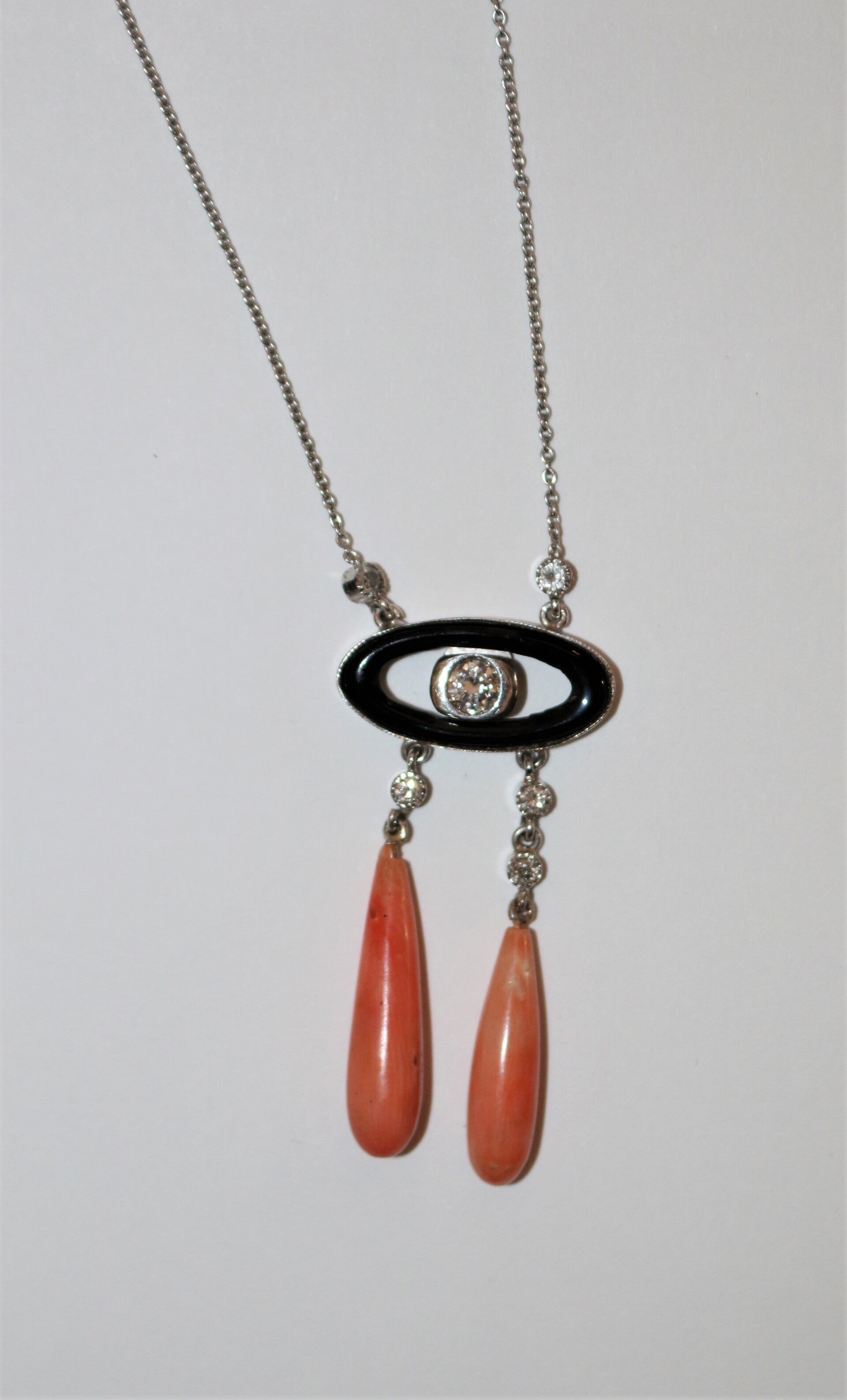 Collier "Négligé" ras de cou en or gris 750/1000e (18 k) de style Art Déco, orné d'un motif en onyx centré d'un diamant taille brillant d'environ 4,8 mm, encadré de 5 diamants taille brillant d'environ 2 mm, portant 2 gouttes de corail