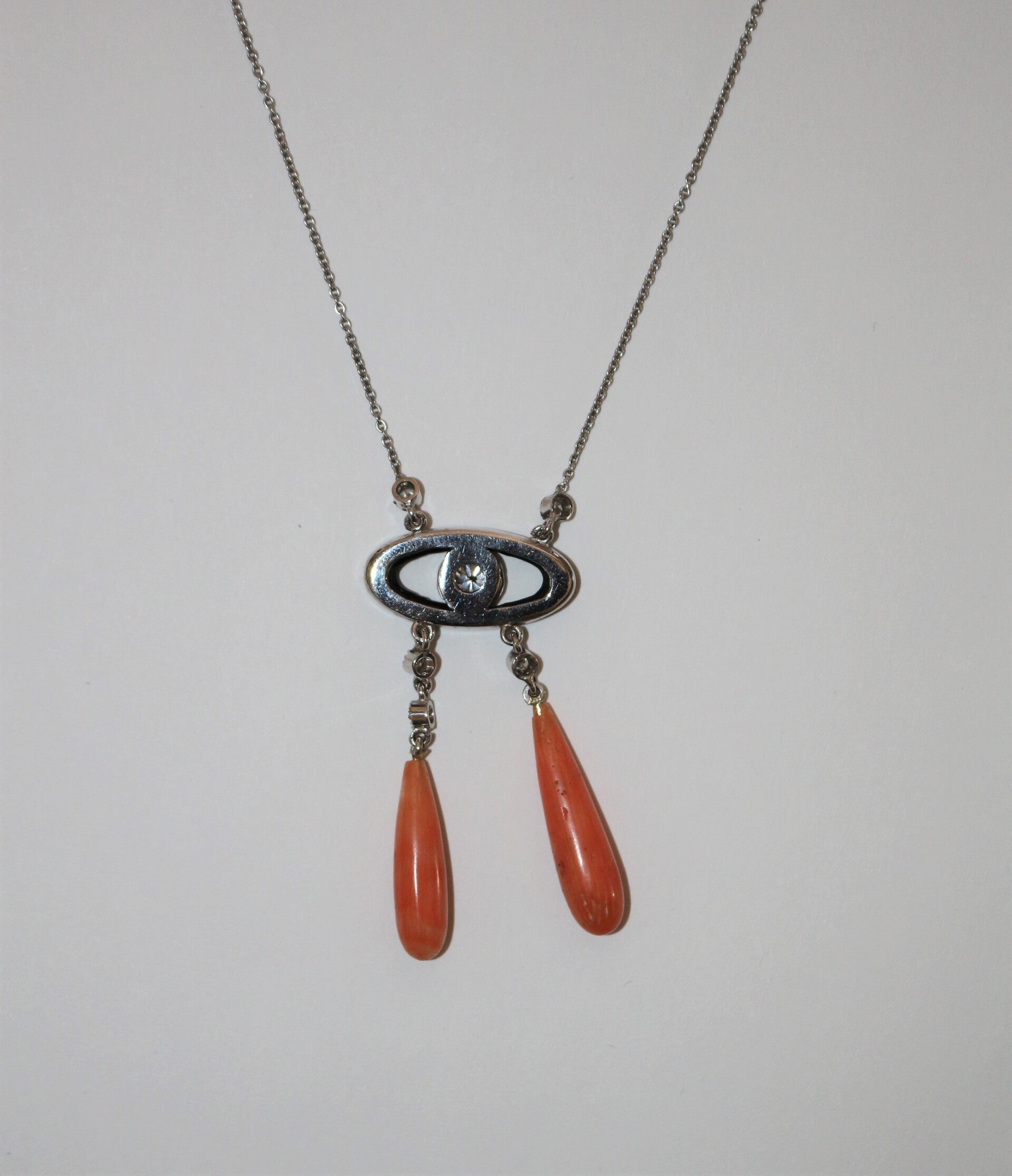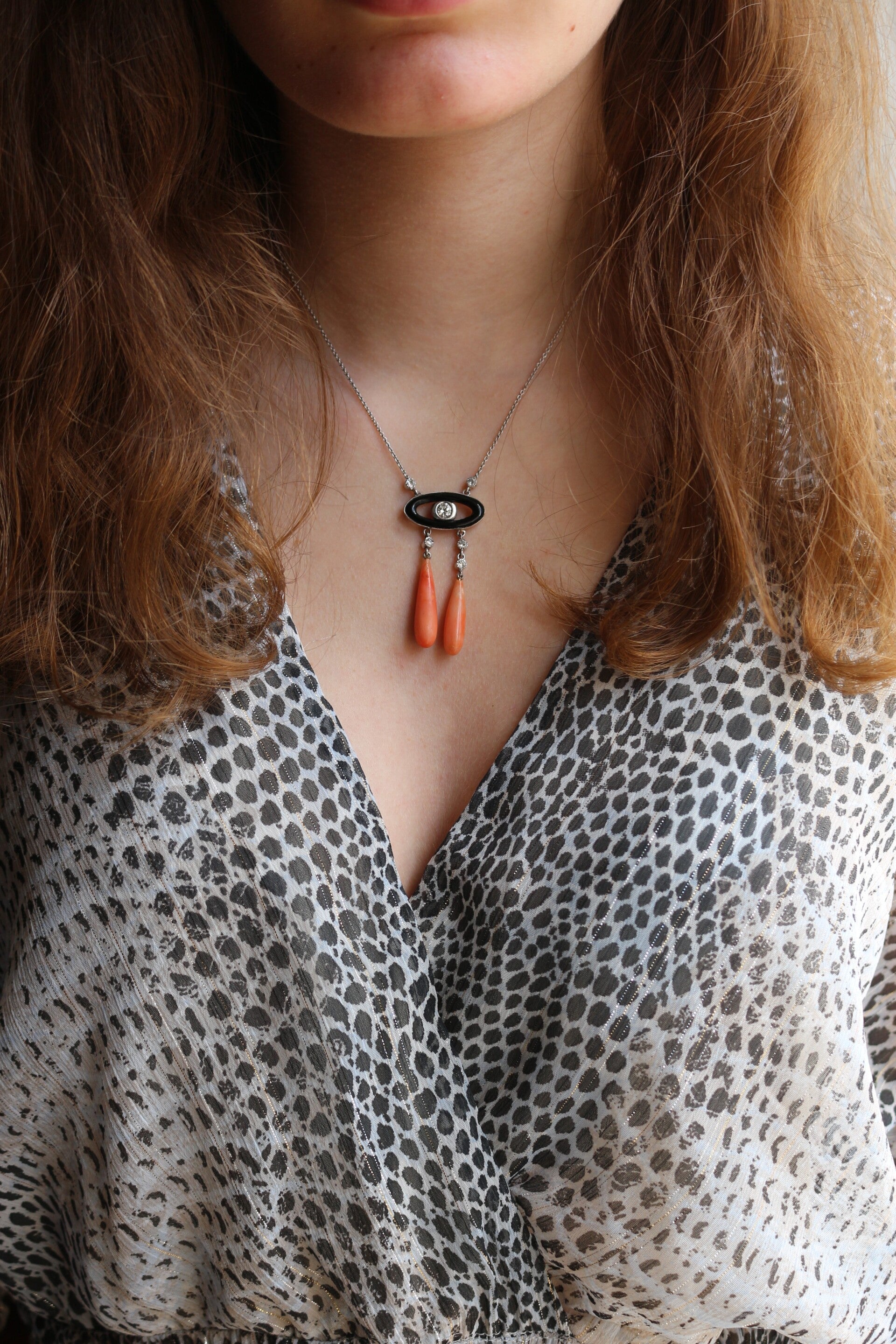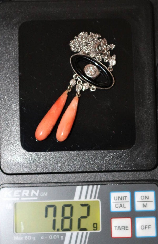 Collier "Négligé" ras de cou en or gris 750/1000e (18 k) de style Art Déco, orné d'un motif en onyx centré d'un diamant taille brillant d'environ 4,8 mm, encadré de 5 diamants taille brillant d'environ 2 mm, portant 2 gouttes de corail
