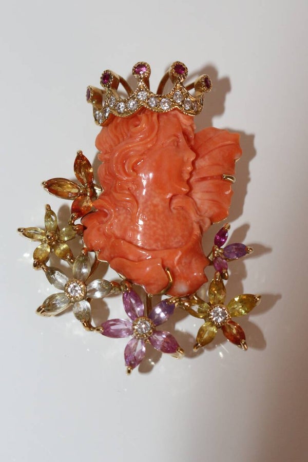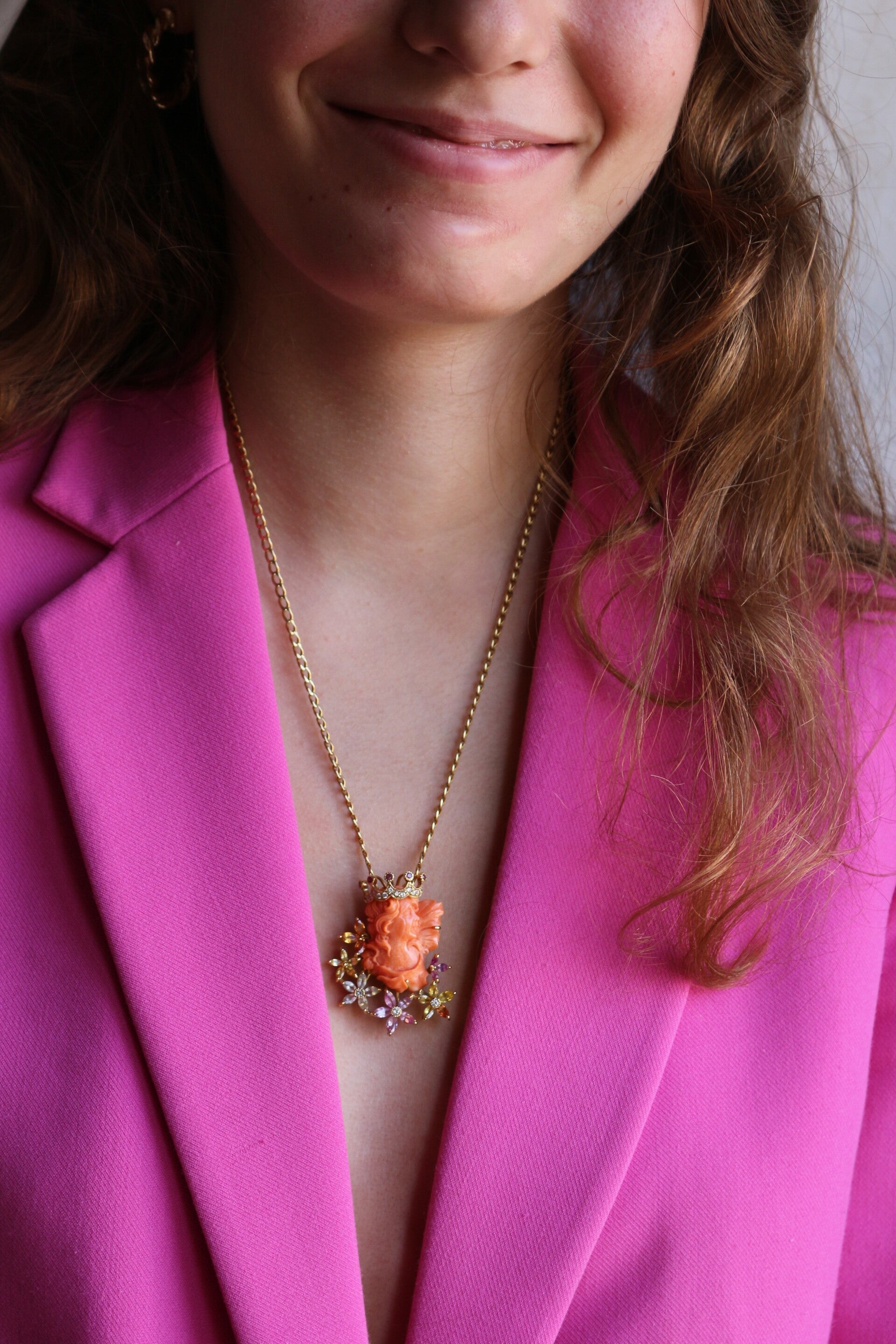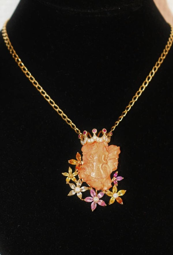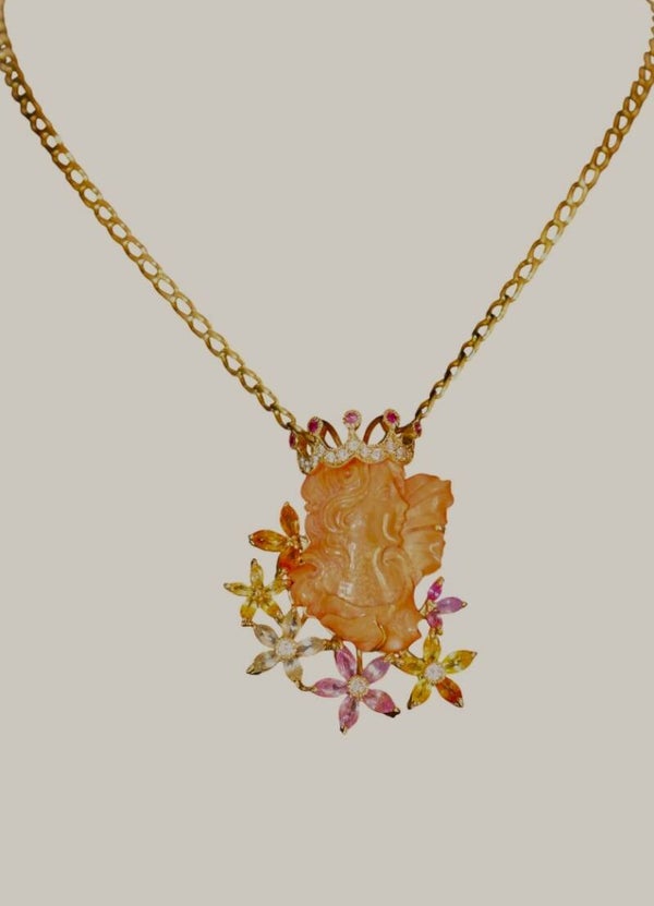 Collier en or jaune 750/1000e (18k) et son pendentif centré d'un profil couronné de jeune femme en corail sculpté, de style Art Nouveau, souligné de fleurs en gemmes de couleur (pierres fines), rehaussé de diamants taille brillant (13 x 1.2 mm et 3 x 2.2 mm) pour un total de 0.34 ct.