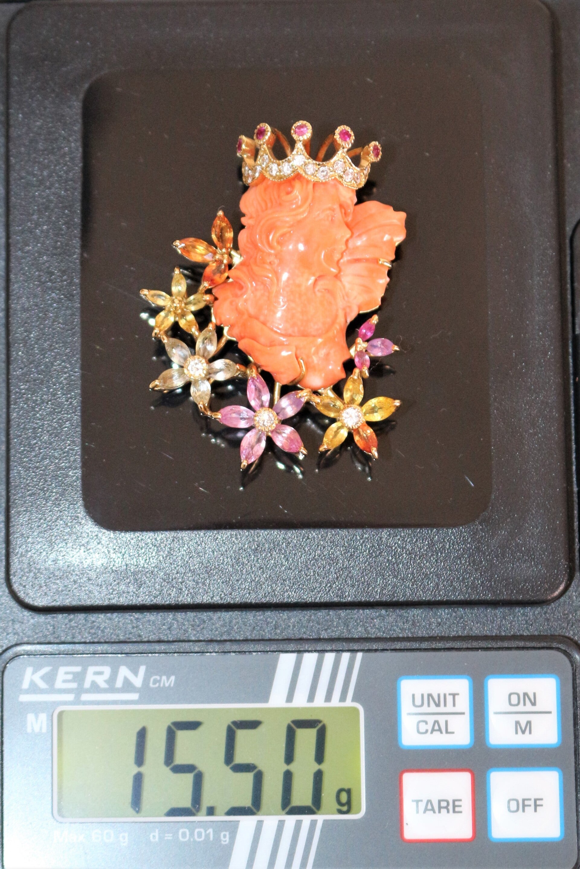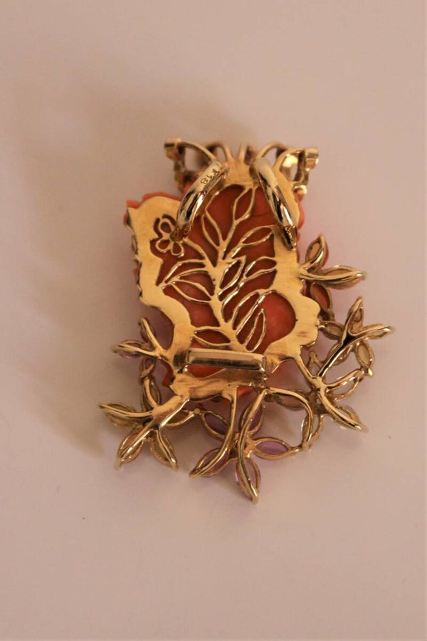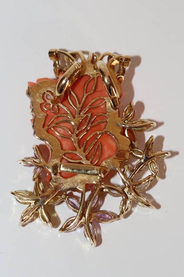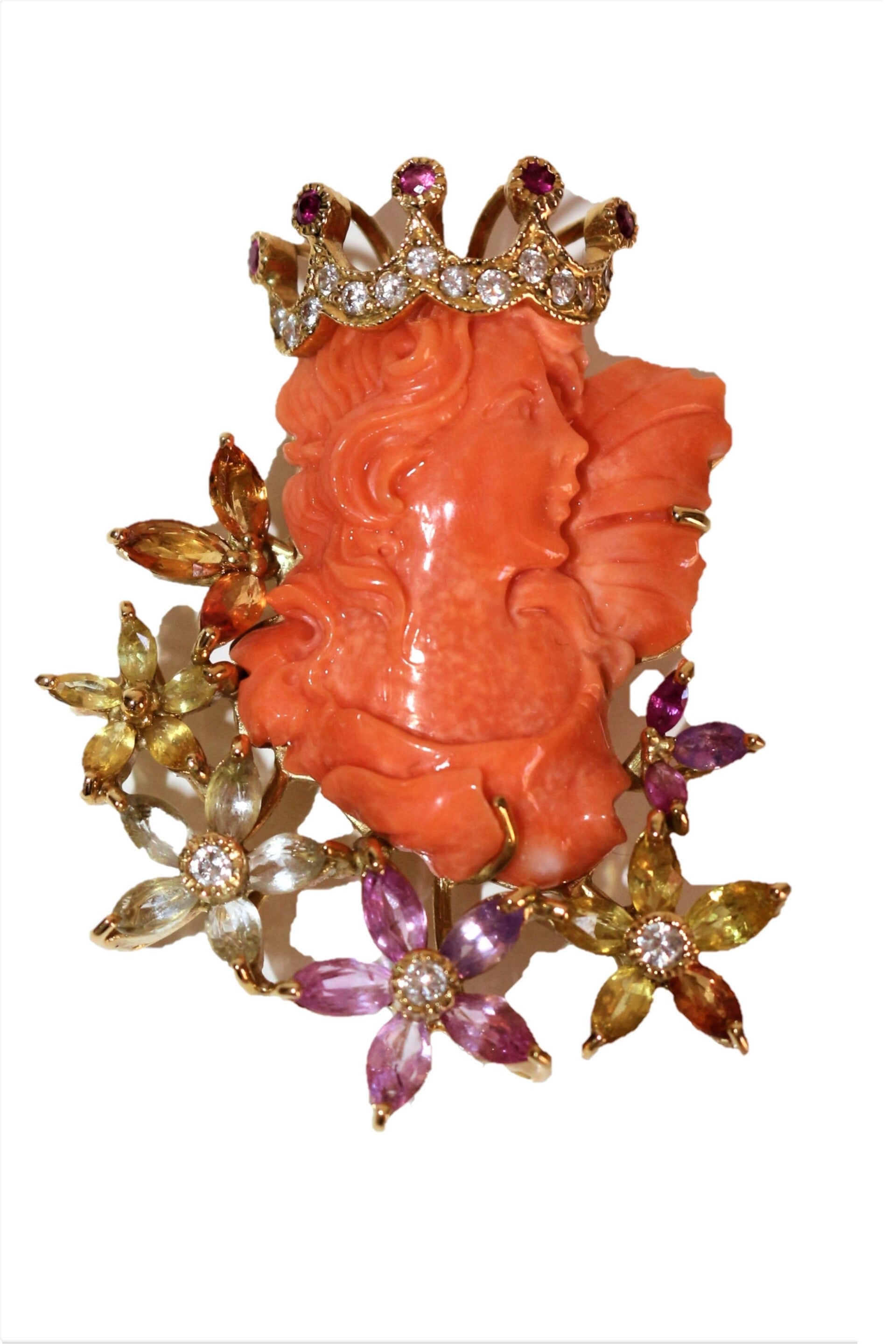 Collier en or jaune 750/1000e (18k) et son pendentif centré d'un profil couronné de jeune femme en corail sculpté, de style Art Nouveau, souligné de fleurs en gemmes de couleur (pierres fines), rehaussé de diamants taille brillant (13 x 1.2 mm et 3 x 2.2 mm) pour un total de 0.34 ct.