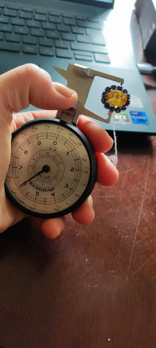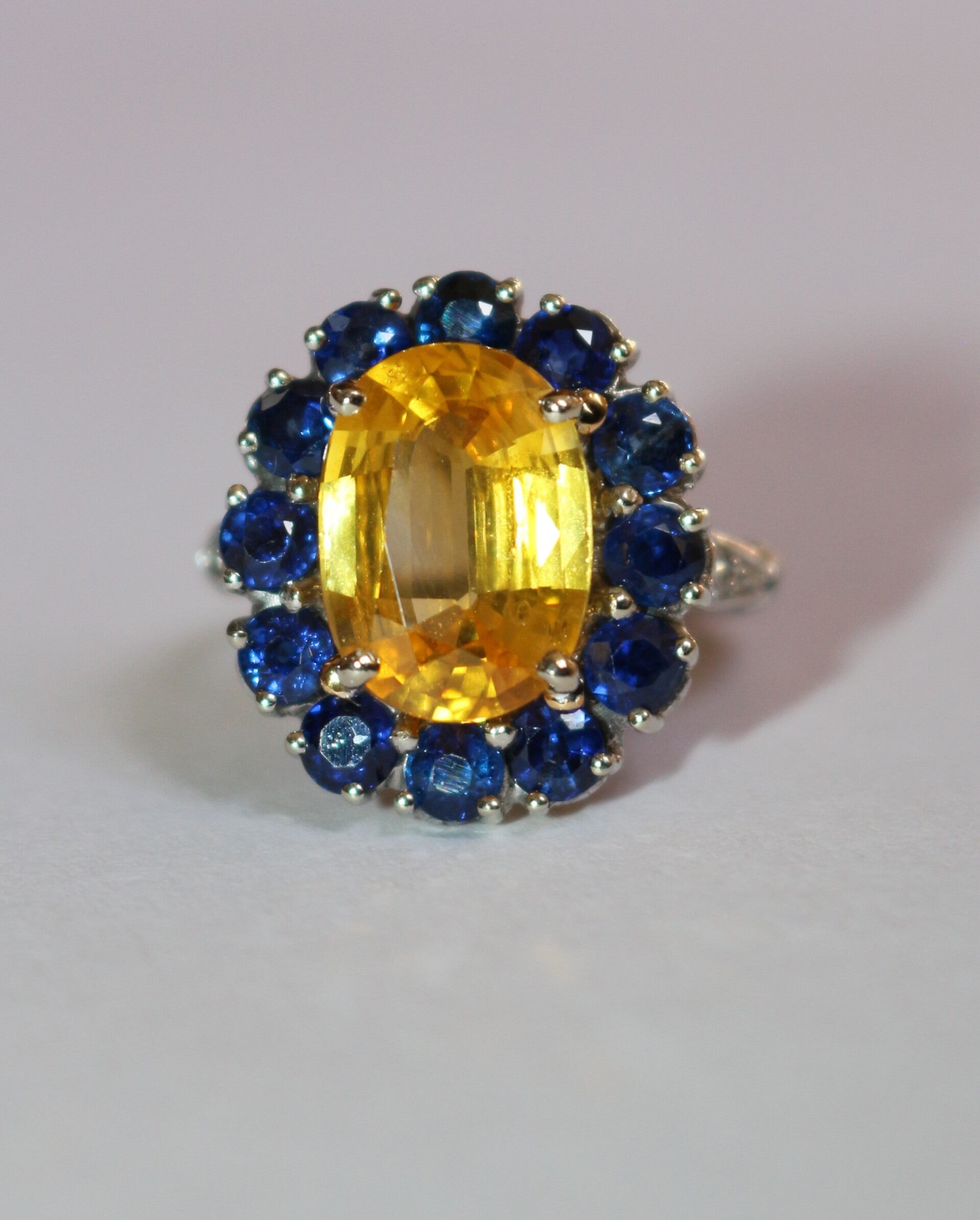 Bague marguerite en or blanc 750/1000e (18 carats) sertie d'un saphir jaune ovale d'environ 3,86 carats (12.2 mm / 8.8 mm / 4.5 mm), dans un entourage de 12 saphirs ronds pour un total de 2,28 carats (3 mm) épaulée de 2 petits brillants de chaque côté.