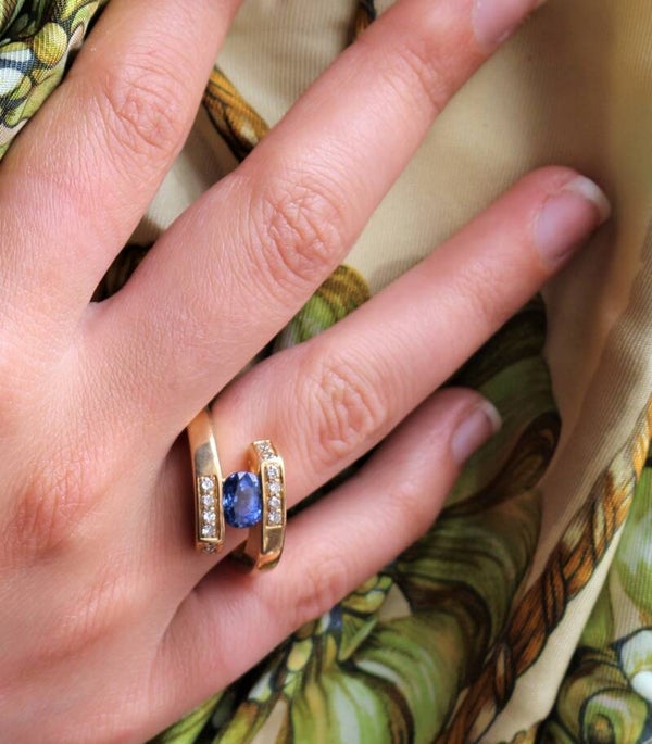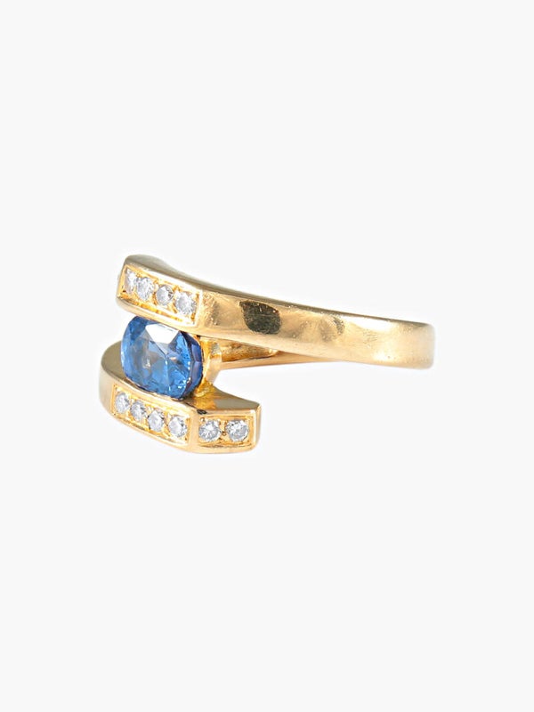 Bague en or jaune 750/1000e (18cts) ornée d’un saphir du Sri Lanka d’environ 1,5 ct sertie de 12 brillants, accompagnée d’un pli gemmologique pour le saphir