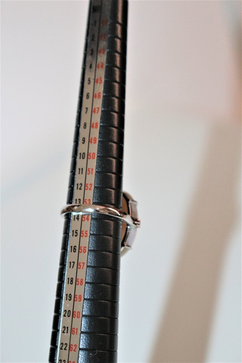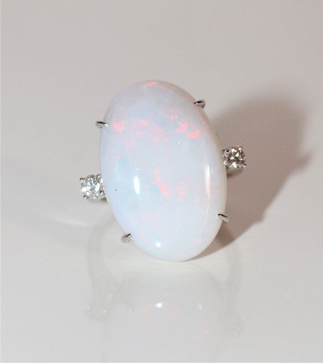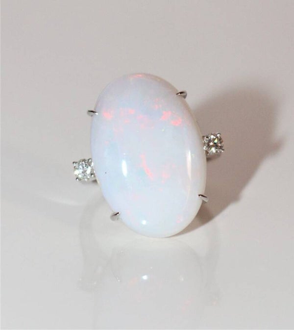 Bague en or gris 750/1000e (18k) ornée d'une importante opale ovale blanche d'Australie en serti griffe, épaulée de 2 diamants taille brillant de 0,10 ct chacun (3mm environ de diamètre)