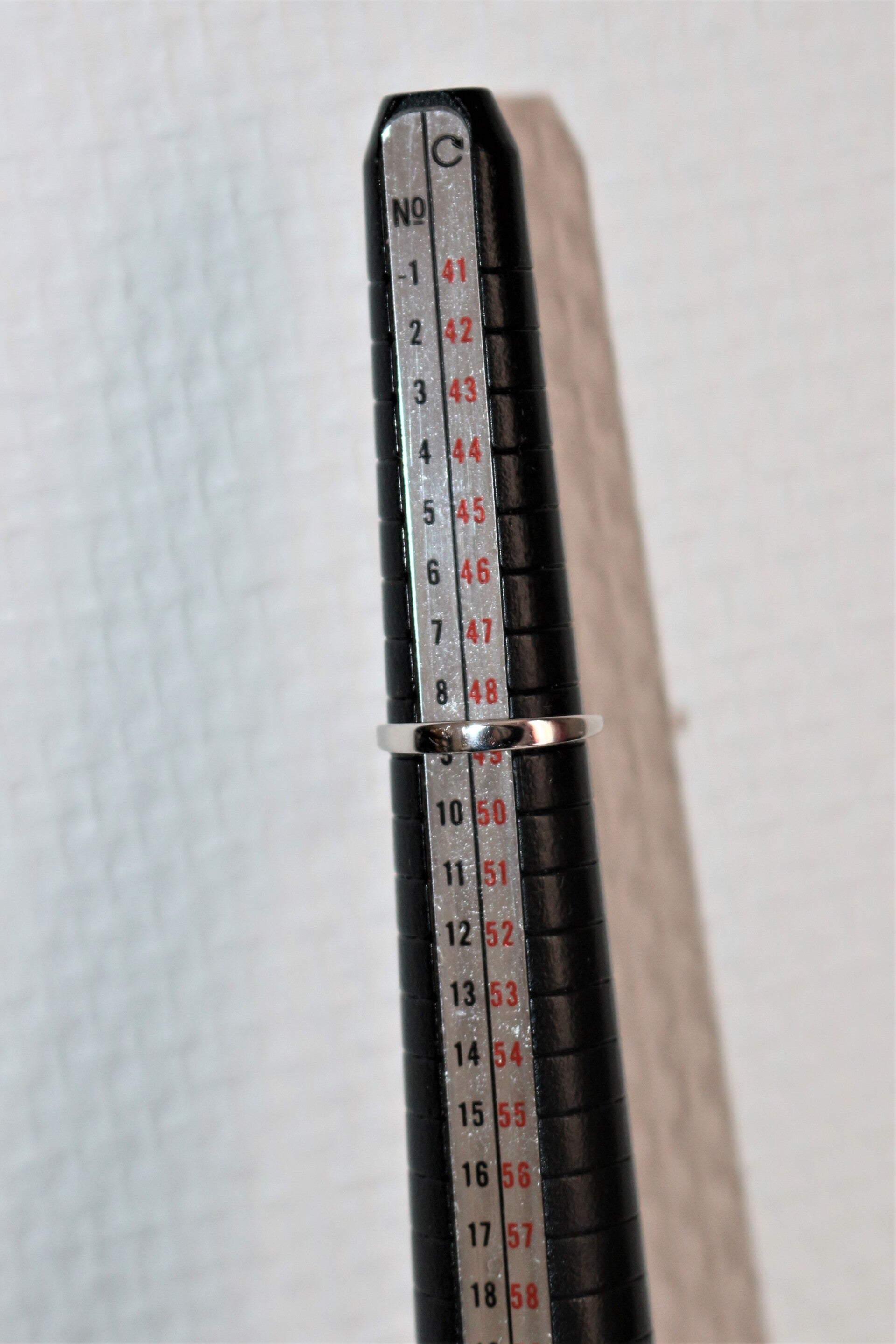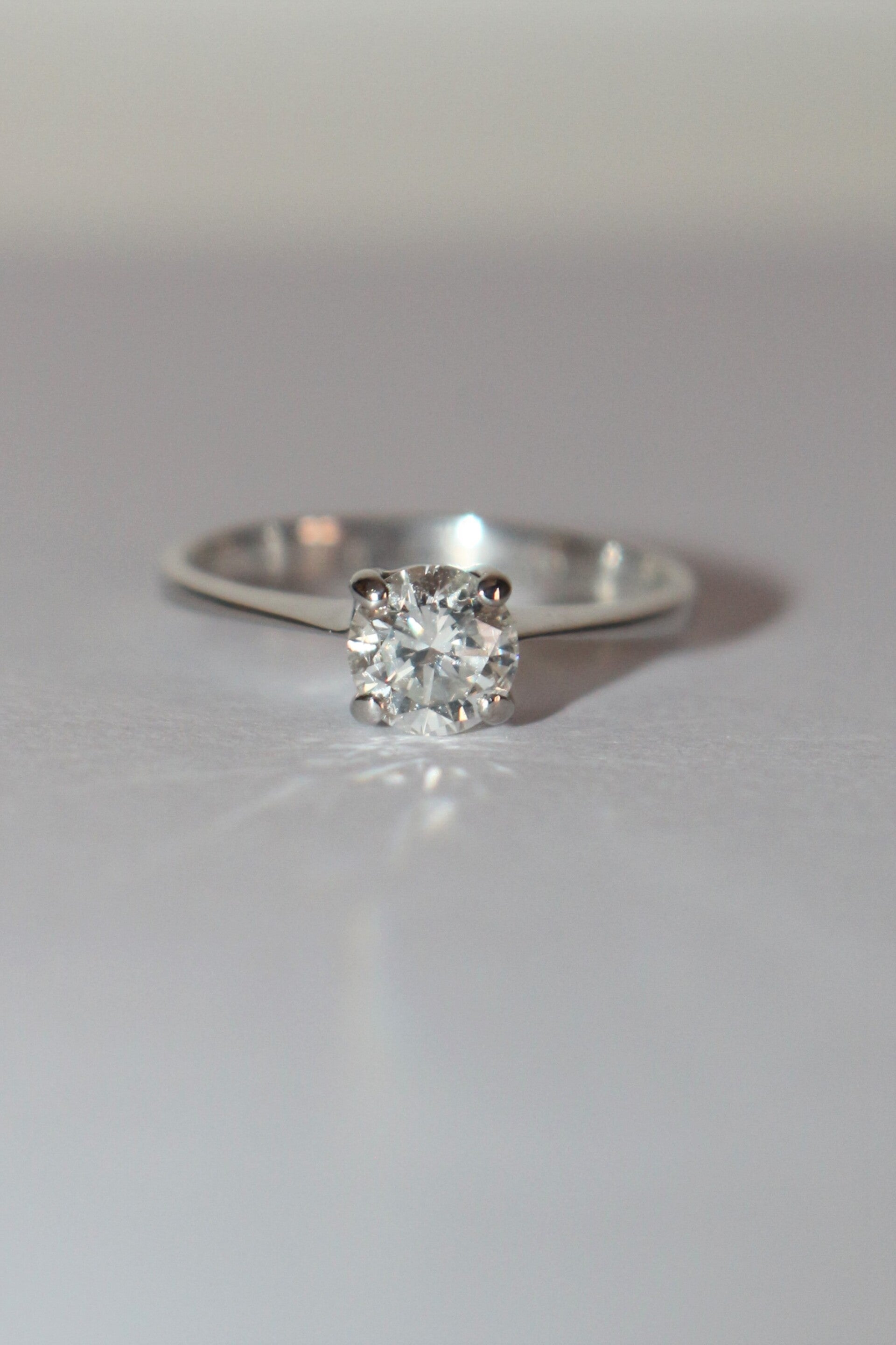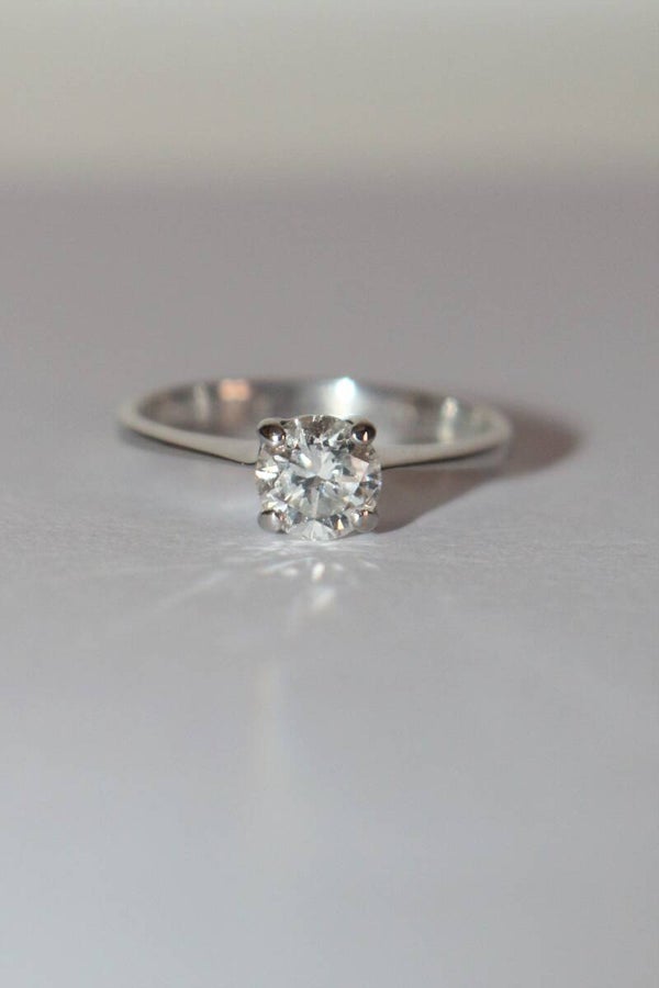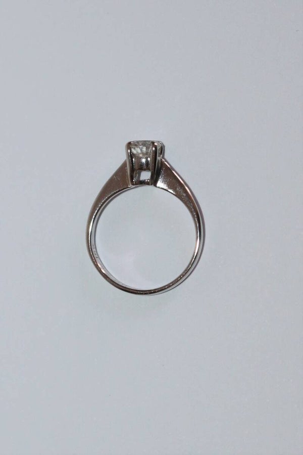 Bague solitaire, en or blanc 750/1000e, sertie d'un diamant taille brillant, en très bel état, rhodiée récemment, design moderniste